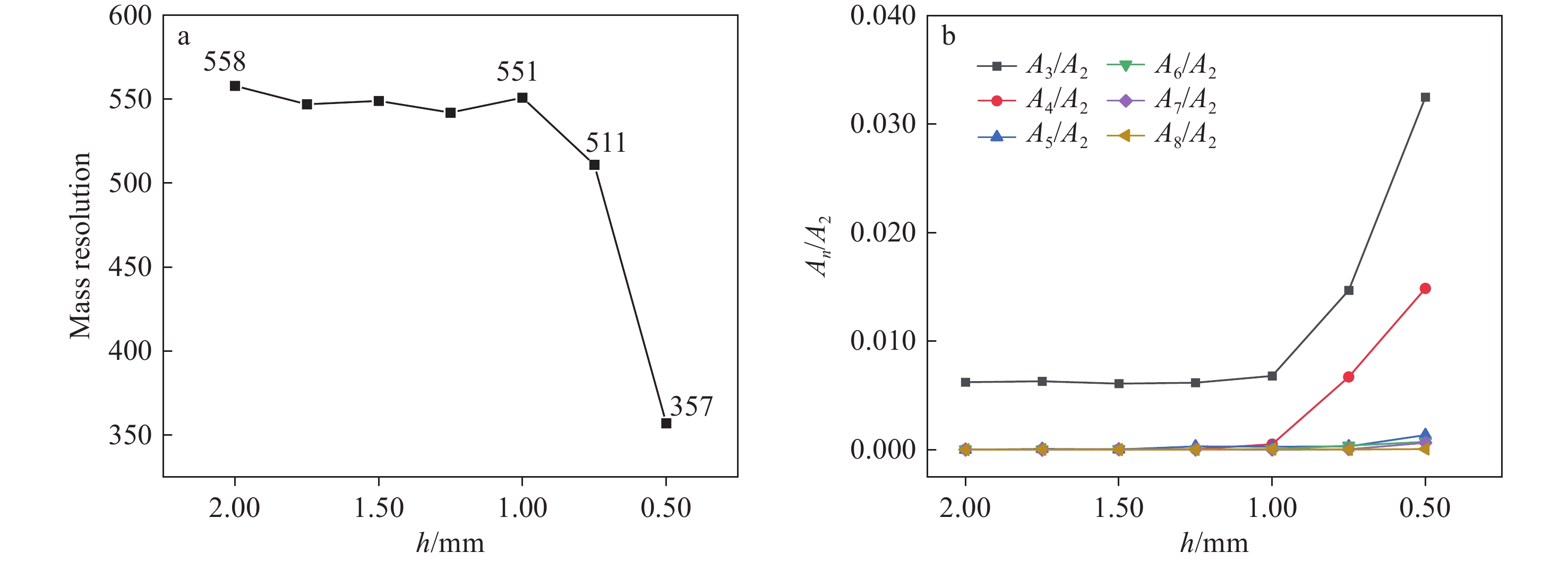 将离子出射槽宽度d固定为300 μm,“拉伸”比ry/rx设为1.6,在[2.0 mm,0.5 mm]区间内以0.25 mm为步进削减电极截断长度h,得到的质量分辨率和电场成分变化图示于图8。由图8a可见,质量分辨率在2~1 mm范围内下降趋势不明显;随着h的进一步减小,分辨性能快速下降。对照图8b可知,此时离子阱内部质量分析区域中的高阶场成分A3A4占比急剧上升,并开始逐渐产生更高阶场A5等,表明过短的电极截断长度造成了离子阱内部电场的畸变,从而导致其分析性能下降。综合考虑后,确定双曲面电极截断长度h的最优值为1 mm。经结构参数优化后,M-HLIT的体积为0.62 cm3,仅为传统线性离子阱体积的25.5%,显著减小了离子阱的尺寸和重量,且质量分辨率维持在551,接近理想结构的质量分辨性能。