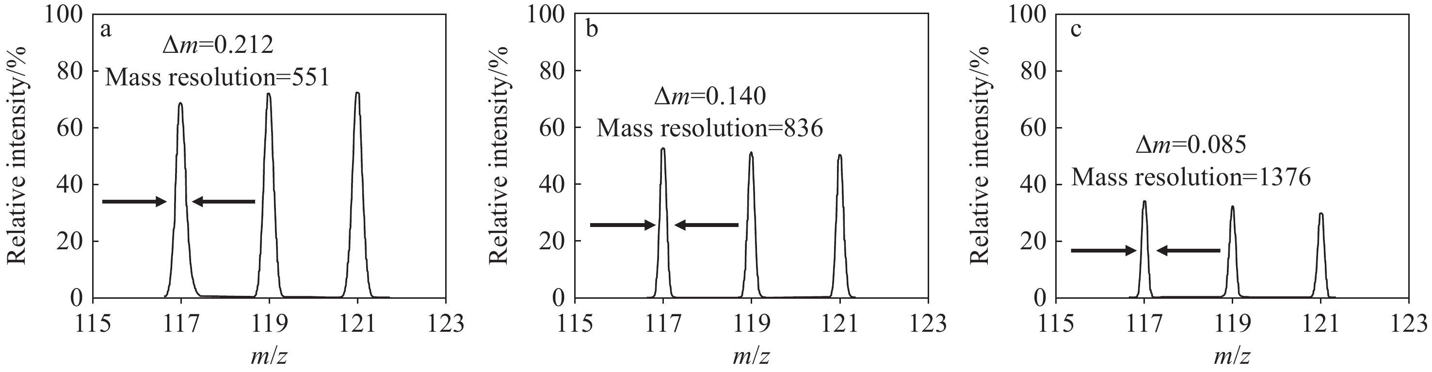 • 本研究对上述参数d=300 μm、ry/rx=1.6、h=1 mm的M-HLIT模型进行不同扫描速率的性能分析,得到的质谱图示于图9。结果表明,随着扫描速率从2250 Th/s降至600 Th/s,相应的质谱峰形变细且无畸变,分辨率提高至1 376,优于在相同扫描速率下本团队设计的场半径3 mm的半圆形电极线性离子阱[22]。这表明,该M-HLIT不仅体积微小,同时具备良好的质量分析性能,还可以进一步降低扫描速率以获得更高的分辨率。然而,过慢的扫描速率会导致离子之间相互作用时间增长,从而造成灵敏度损失。在实际质量分析过程中,可根据现场条件选择适宜的扫描速率。