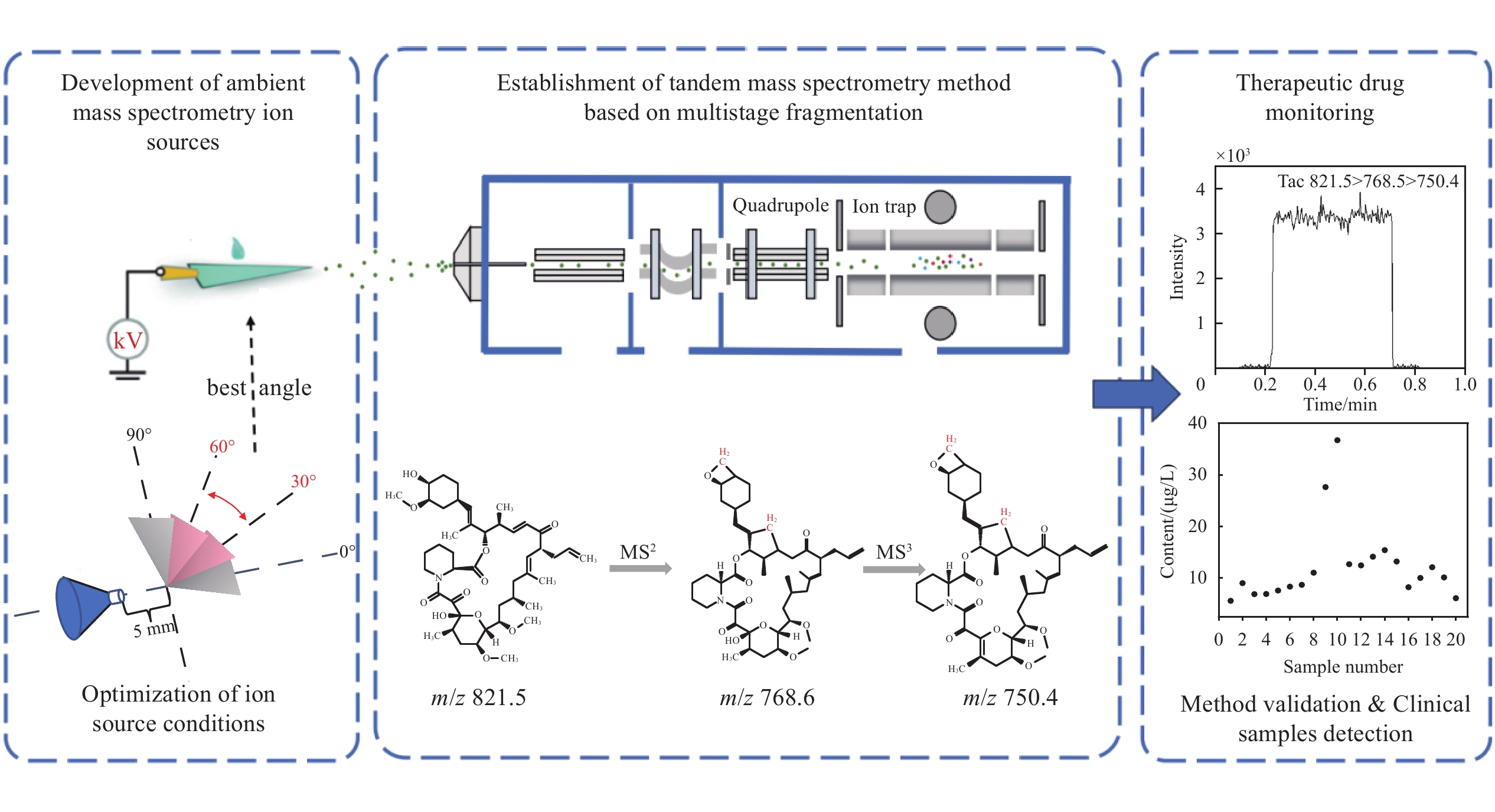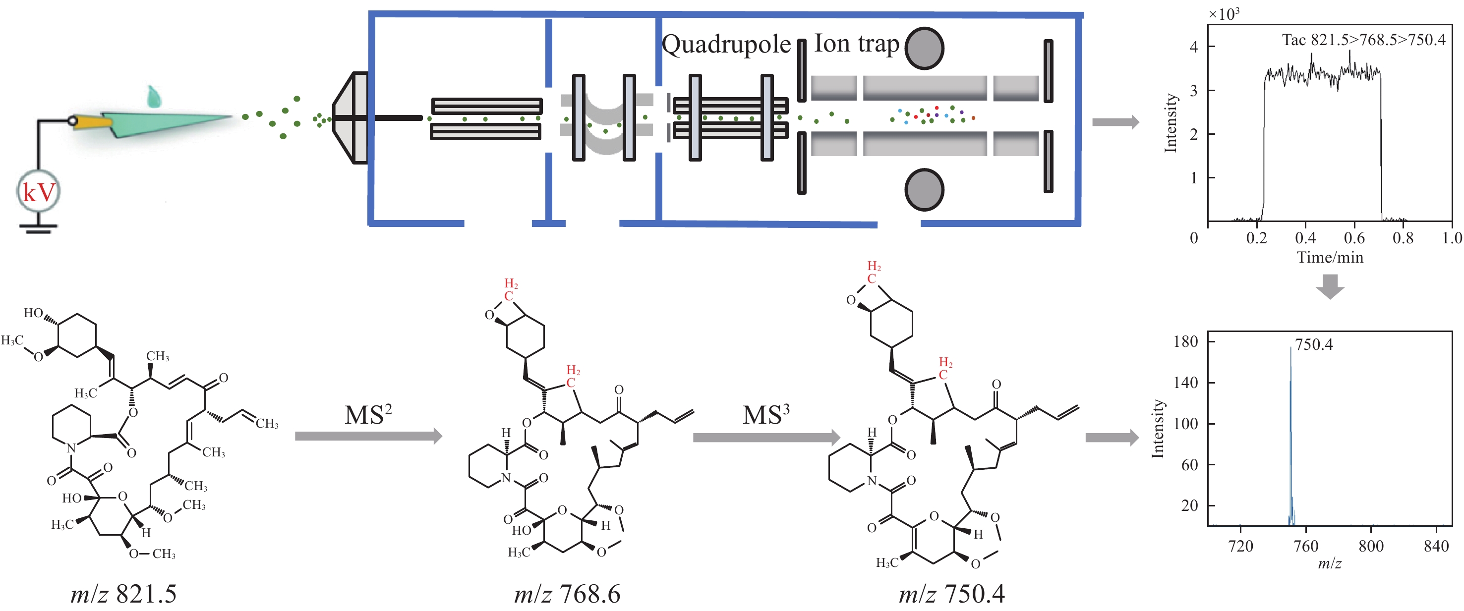 [1] KINO T, HATANAKA H, HASHIMOTO M, NISHIYAMA M, GOTO T, OKUHARA M, KOHSAKA M, AOKI H, IMANAKA H. FK-506, a novel immunosuppressant isolated from a Streptomyces. I. Fermentation, isolation, and physico-chemical and biological characteristics[J]. The Journal of Antibiotics, 1987, 40(9): 1 249-1 255. [2] 宋爱凤, 胡萍, 杨大伟. 他克莫司血药浓度检测方法的研究进展[J]. 现代药物与临床, 2019, 34(11): 3 497-3 500. SONG Aifeng, HU Ping, YANG Dawei. Research progress on detection methods of tacrolimus blood concentration[J]. Drugs & Clinic, 2019, 34(11): 3 497-3 500(in Chinese). [3] MIYATA S, OHKUBO Y, MUTOH S. A review of the action of tacrolimus (FK506) on experimental models of rheumatoid arthritis[J]. Inflammation Research, 2005, 54(1): 1 -9 . doi: 10.1007/s00011-004-1318-5[4] 张金萍, 王相峰, 宋燕青. CYP3A5多态性对肾移植术后患者他克莫司药代动力学的影响[J]. 实用器官移植电子杂志, 2020, 8(1): 68 -70 . doi: 10.3969/j.issn.2095-5332.2020.01.018 ZHANG Jinping, WANG Xiangfeng, SONG Yanqing. Effect of CYP3A5 polymorphism on pharmacokinetics of tacrolimus in patients after renal transplantation[J]. Practical Journal of Organ Transplantation (Electronic Version), 2020, 8(1):68 -70 (in Chinese). doi: 10.3969/j.issn.2095-5332.2020.01.018[5] 王意如. 免疫抑制剂研究新进展[J]. 中国新药杂志, 2002, 11(7): 512 -515 . doi: 10.3321/j.issn:1003-3734.2002.07.004 WANG Yiru. Recent advances in immunosuppressive drugs[J]. Chinese New Drugs Journal, 2002, 11(7):512 -515 (in Chinese). doi: 10.3321/j.issn:1003-3734.2002.07.004[6] 黄金沐, 池慧琼, 张忠阳. 他克莫司的研究概况[J]. 海峡药学, 2010, 22(11): 148 -150 . doi: 10.3969/j.issn.1006-3765.2010.11.073 HUANG Jinmu, CHI Huiqiong, ZHANG Zhongyang. General situation of tacrolimus research[J]. Strait Pharmaceutical Journal, 2010, 22(11):148 -150 (in Chinese). doi: 10.3969/j.issn.1006-3765.2010.11.073[7] 王立明, 闵志廉, 朱有华, 高春芳, 陆慧琦, 周梅生, 姚亚成. 肾移植受者应用他克莫司治疗窗浓度的探讨[J]. 中华器官移植杂志, 2000, 21(3): 145 -146 . WANG Liming, MIN Zhilian, ZHU Youhua, GAO Chunfang, LU Huiqi, ZHOU Meisheng, YAO Yacheng. Clinical research of FK506 therapeutic window concentration in renal transplant recipients[J]. Chineae Journal of Organ Transplantation, 2000, 21(3):145 -146 (in Chinese) .[8] ALAK A M. Measurement of tacrolimus (FK506) and its metabolites: a review of assay development and application in therapeutic drug monitoring and pharmacokinetic studies[J]. Therapeutic Drug Monitoring, 1997, 19(3): 338 -351 . doi: 10.1097/00007691-199706000-00016[9] RODRÍGUEZ FABA O, BOISSIER R, BUDDE K, FIGUEIREDO A, TAYLOR C F, HEVIA V, LLEDÓ GARCÍA E, REGELE H, ZAKRI R H, OLSBURGH J, BREDA A. European association of urology guidelines on renal transplantation: update 2018[J]. European Urology Focus, 2018, 4(2): 208 -215 . doi: 10.1016/j.euf.2018.07.014[10] BANSAL S. Therapeutic drug monitoring of tacrolimus in kidney transplantation[J]. Indian Journal of Transplantation, 2020, 14(1): 8 . doi: 10.4103/ijot.ijot_4_20[11] 孙艺哲, 张平安. 肾移植患者他克莫司血药谷浓度与肝肾功能及血常规指标的关系[J]. 贵州医药, 2019, 43(1): 79 -82 . doi: 10.3969/j.issn.1000-744X.2019.01.027 SUN Yizhe, ZHANG Ping’an. Relationship between the concentration of tacrolimus in blood and liver and kidney function and blood routine indexes in renal transplant patients[J]. Guizhou Medical Journal, 2019, 43(1):79 -82 (in Chinese). doi: 10.3969/j.issn.1000-744X.2019.01.027[12] 陈惠芳, 刘锋, 吴丽荣, 苏丽婷. 环孢素A和他克莫司血药浓度检测方法比较分析[J]. 中国处方药, 2019, 17(9): 41 -42 . CHEN Huifang, LIU Feng, WU Lirong, SU Liting. Comparative analysis of detection methods of cyclosporine A and tacrolimus in blood[J]. Journal of China Prescription Drug, 2019, 17(9):41 -42 (in Chinese).[13] 梁陈方, 王亚洲. 反相高效液相色谱法测定他克莫司的血药浓度[J]. 广西医学, 2009, 31(3): 425 -426 . LIANG Chenfang, WANG Yazhou. Determination of tacrolimus in plasma by RP-HPLC[J]. Guangxi Medical Journal, 2009, 31(3):425 -426 (in Chinese).[14] SHIPKOVA M, VALBUENA H. Liquid chromatography tandem mass spectrometry for therapeutic drug monitoring of immunosuppressive drugs: achievements, lessons and open issues[J]. TrAC Trends in Analytical Chemistry, 2016, 84: 23 -33 . doi: 10.1016/j.trac.2016.01.031[15] ZHENG Y Z, WANG S. Advances in antifungal drug measurement by liquid chromatography-mass spectrometry[J]. Clinica Chimica Acta, 2019, 491: 132 -145 . doi: 10.1016/j.cca.2019.01.023[16] BIANCHI F, RIBONI N, TERMOPOLI V, MENDEZ L, MEDINA I, ILAG L, CAPPIELLO A, CARERI M. MS-based analytical techniques: advances in spray-based methods and EI-LC-MS applications[J]. Journal of Analytical Methods in Chemistry, 2018, 2018(1): 1 308 167. [17] 刘欢, 崔球. 原位电离质谱技术在微生物菌株筛选中的应用进展[J]. 合成生物学, 2023, 4(5): 980 -999 . LIU Huan, CUI Qiu. Advances and applications of ambient ionization mass spectrometry in screening of microbial strains[J]. Synthetic Biology Journal, 2023, 4(5):980 -999 (in Chinese).[18] THOMAS S N, FRENCH D, JANNETTO P J, RAPPOLD B A, CLARKE W A. Liquid chromatography-tandem mass spectrometry for clinical diagnostics[J]. Nature Reviews Methods Primers, 2022, 2(1): 96 . doi: 10.1038/s43586-022-00175-x[19] BENEITO-CAMBRA M, GILBERT-LÓPEZ B, MORENO-GONZÁLEZ D, BOUZA M, FRANZKE J, GARCÍA-REYES J F, MOLINA-DÍAZ A. Ambient (desorption/ionization) mass spectrometry methods for pesticide testing in food: a review[J]. Analytical Methods, 2020, 12(40): 4 831-4 852. [20] McBRIDE E M, MACH P M, DHUMMAKUPT E S, DOWLING S, CARMANY D O, DEMOND P S, RIZZO G, MANICKE N E, GLAROS T. Paper spray ionization: applications and perspectives[J]. TrAC Trends in Analytical Chemistry, 2019, 118: 722 -730 . doi: 10.1016/j.trac.201