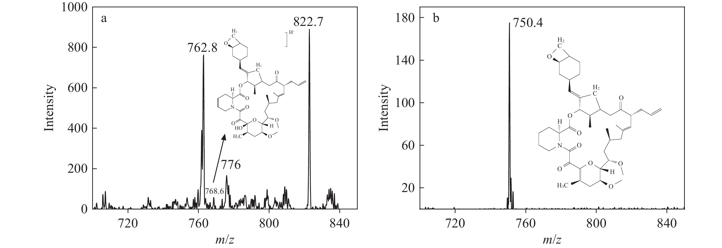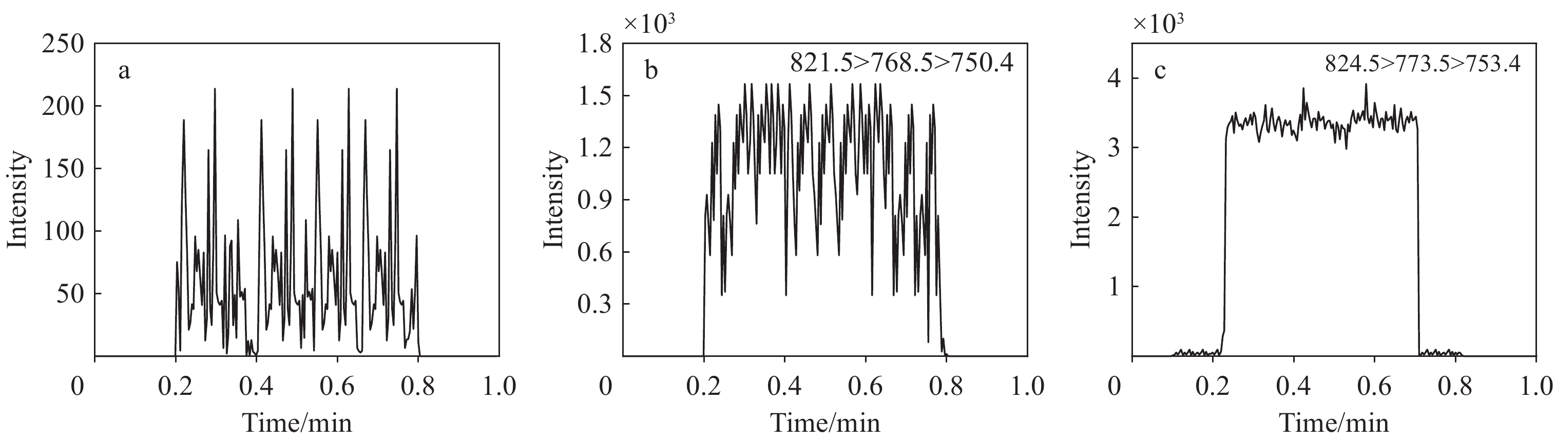 在进行二级离子定量分析时,由于样品基质复杂,质谱中存在杂质离子m/z 762.8和822.7的干扰,示于图2a。可以发现,目标二级离子m/z 768.6的强度相对较低,且信噪比低。为了降低基质干扰并提高信噪比,对m/z 762.8进行再次碎裂,得到三级离子m/z 750.4和718.4。由于m/z 750.4的响应强度优于m/z 718.4,故选择m/z 750.4作为定量离子,m/z 718.4作为定性离子,结果示于图2b。