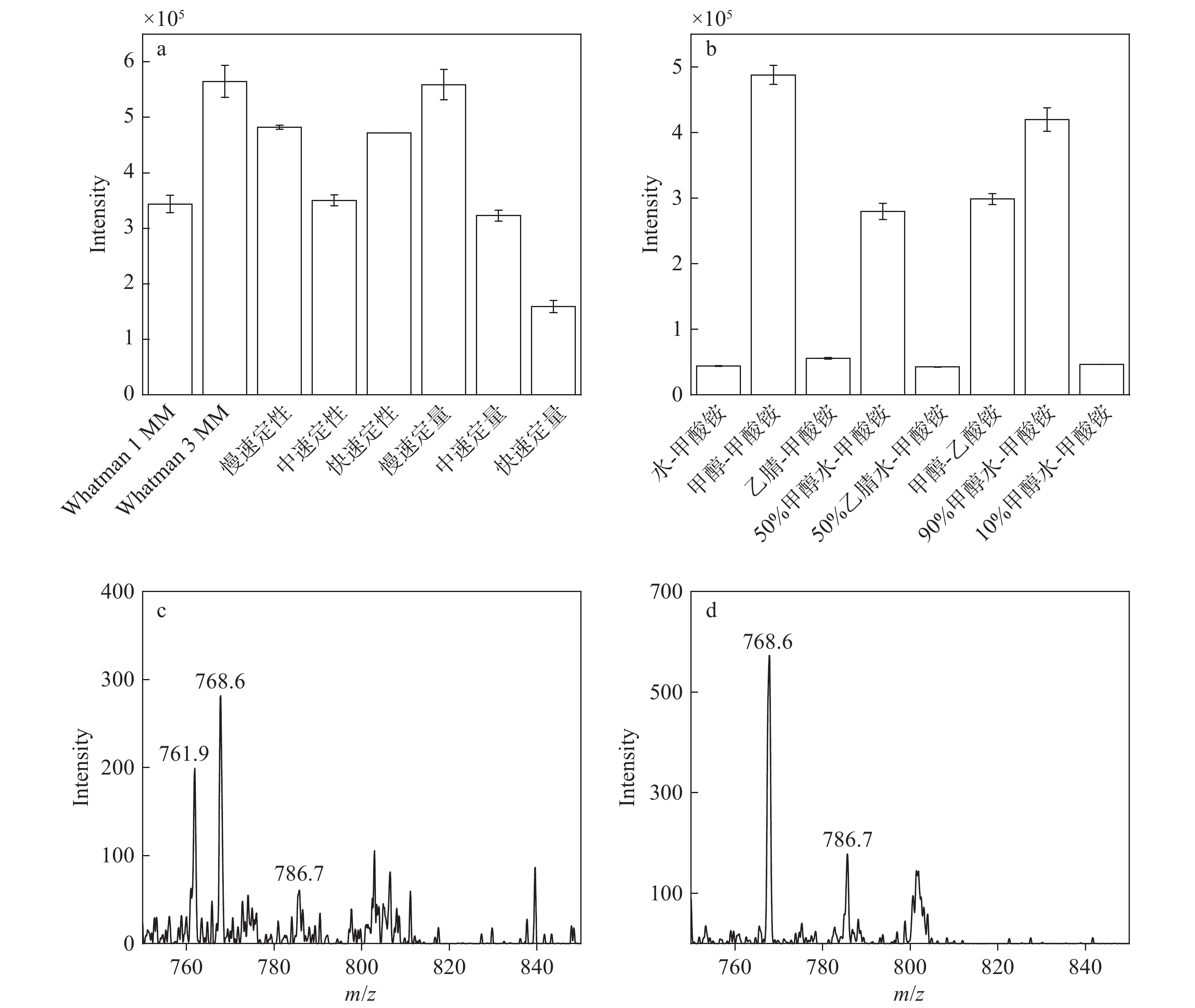 纸的表面性质对洗脱和电离效率具有决定性影响,进而影响目标物的响应强度。基于9种不同纸基材料进行纸喷雾质谱分析,以筛选最适用于他克莫司检测的纸基,各类纸基的响应强度示于图3a。结果表明,使用Whatman 3 MM色谱纸和慢速定量滤纸作为纸喷雾基底时,目标物响应强度均较高,但Whatman 3 MM色谱纸厚度略大于慢速定量滤纸,在滴加相同体积溶剂时,Whatman 3 MM纸基更容易保持其尖端直挺的状态,满足纸喷雾实验要求。在图3a中没有列举FTA 906号采血卡纸,其纸张厚度为500 μm,由于纸张较厚,所需的溶剂量比其他纸基更多,在相同的电压驱动下,喷雾溶剂在纸片表面的延展速度极慢,导致在质谱扫描时间内未能检测到信号。因此,选择Whatman 3 MM色谱纸作为纸喷雾基底。