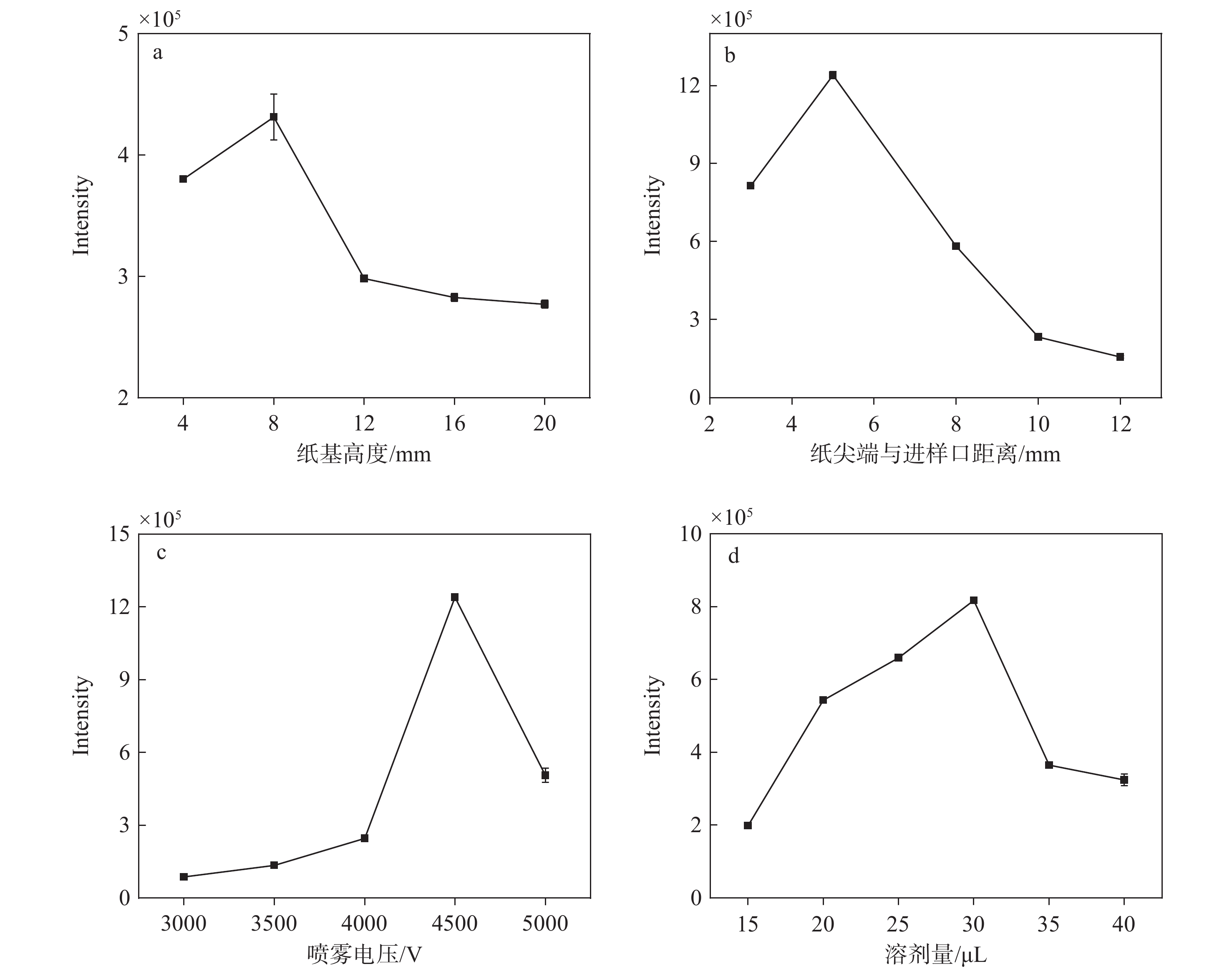 控制纸片底长8 mm,通过改变三角形高度来改变纸基的尖端角度和纸基大小,各高度对应的响应强度示于图4a。当纸基高度为4 mm时,纸基过小,将相同溶剂量滴加在纸片上会使目标物堆积,堆积的样品可能与纸基发生更多的相互作用,增加背景信号,掩盖目标物信号而导致离子化效率降低;当纸基高度为8 mm时,质谱响应达到峰值;当纸基高度大于8 mm时,由于纸片面积过大,目标物未均匀分布在纸基上,使离子化效率降低。在纸基高度8 mm时,纸片的尖端角度约为53°,这个角度能够产生更强的电场,可以提升离子化效率并增强信号强度。同时,合适的尖端角度还有助于维持喷雾的稳定性,减少信号波动。因此,选择底长8 mm、高度8 mm的纸基作为离子源基底。