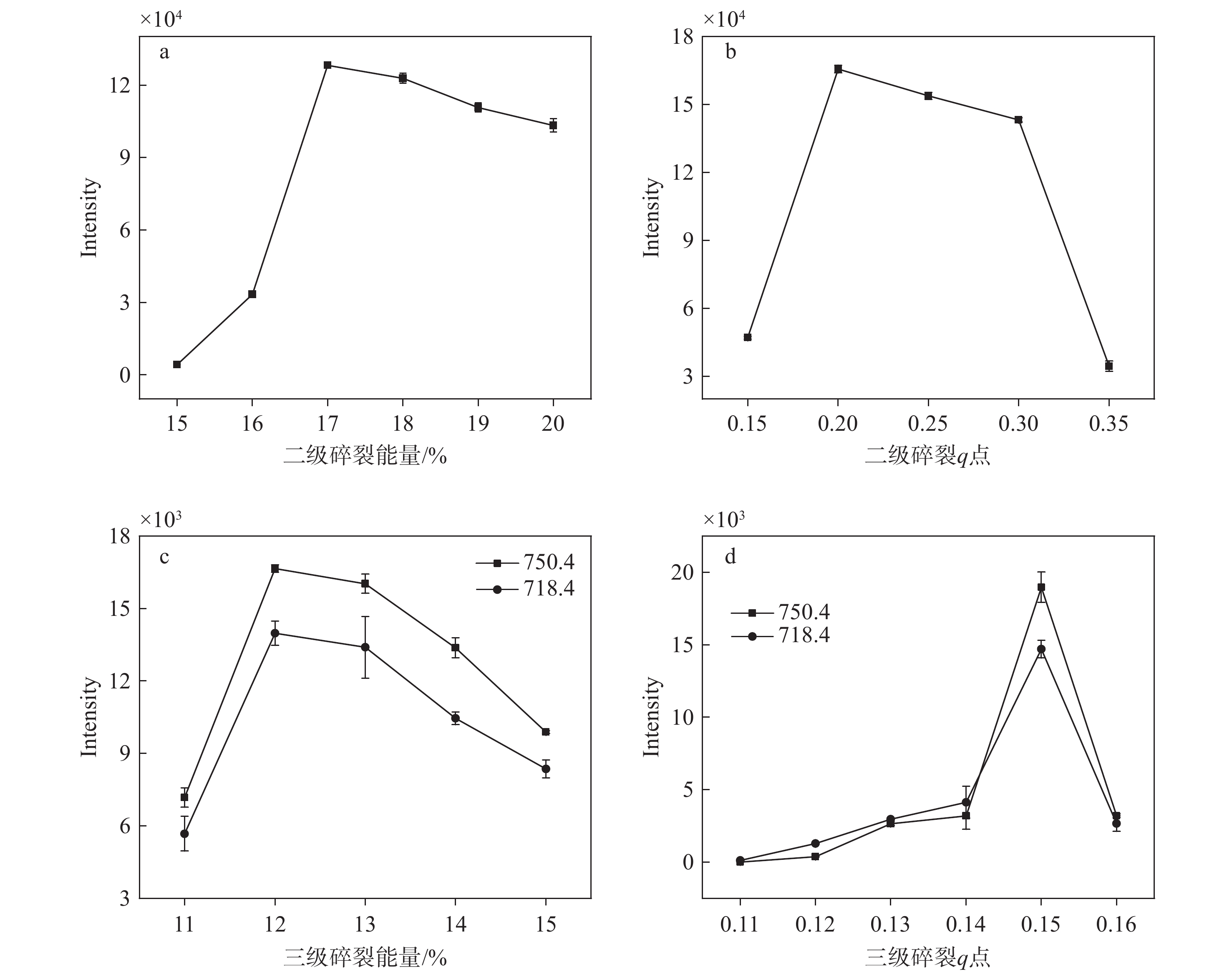 在QLIT-6610MD质谱仪中,首先通过四极杆的选择功能选择目标母离子,消除背景干扰,从而减少进入线形离子阱的离子数量,减弱空间电荷效应。这些母离子进入离子阱后,对目标母离子施加碎裂能量,使其碎裂形成二级碎片离子;二级离子在离子阱中再次被捕获,并应用第2次碎裂能量使其进一步解离形成三级碎片离子。优化碎裂能量不仅可以增强目标物的响应强度,还可以显著降低背景噪声,从而提高定量分析的灵敏度和准确性。如图6所示,优化二级碎裂能量和碎裂q点后,离子强度均提高了约4倍;优化三级碎裂能量和碎裂q点后,离子强度也均提高了约4倍。二次碎裂能量和q点分别为17%和0.2,三级碎裂能量和q点分别为12%和0.15。