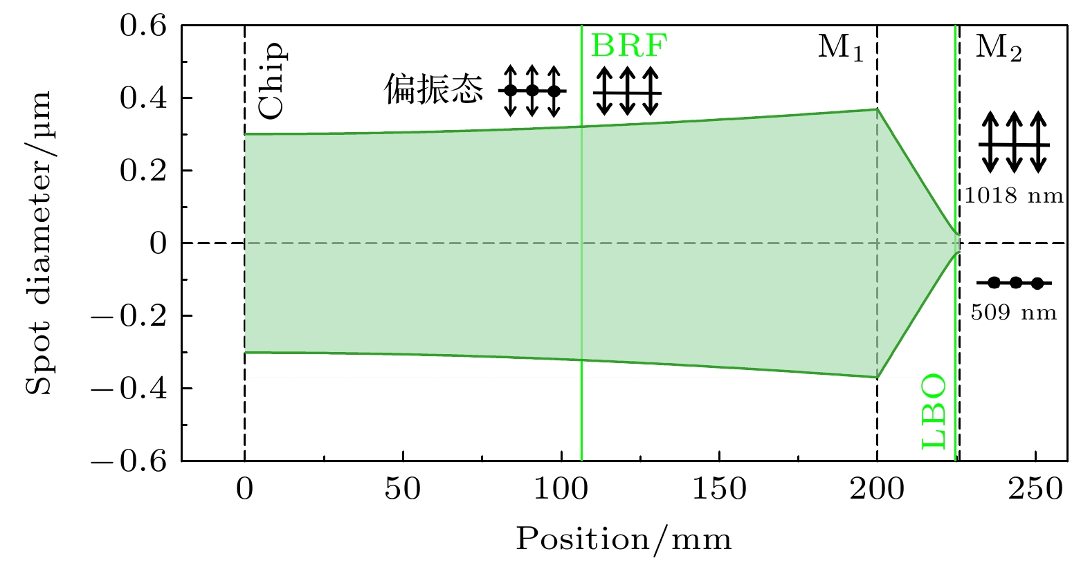 在非线性频率变换过程中, 想要获得高转换效率, 需要选择合适的谐振腔、非线性晶体及其相位匹配类型. 谐振腔的设计主要考虑了增益芯片上激光光斑与泵浦光斑满足模式匹配条件, 以及在非线性晶体上获得尽可能小的光束束腰. 本实验中激光在增益芯片上的光斑直径约为600 μm, 与600 μm泵浦尾纤芯径经过1∶1成像后投射在芯片上的泵浦光斑大致相同. 非线性晶体LBO晶体放置在M1和M2之间的光束束腰处, 束腰的直径约为50 μm. 实验所用的V型谐振腔的腔模半径随位置以及腔内激光的偏振态的变化如图3所示.