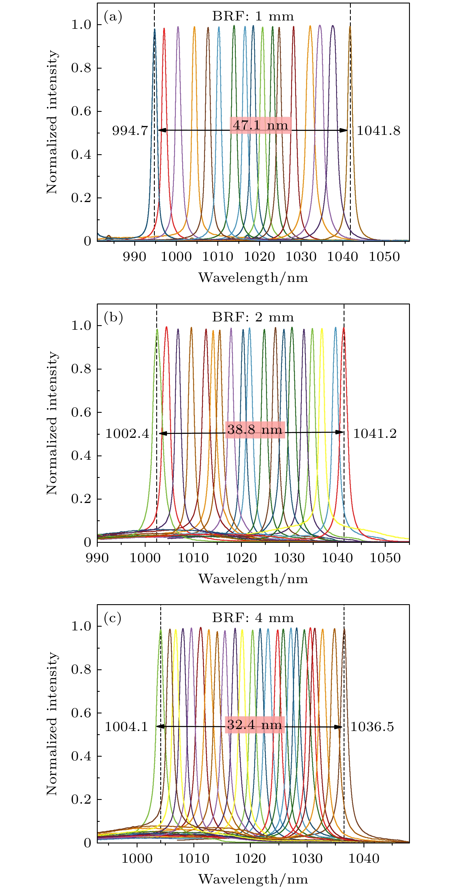 不同厚度的BRF不仅用于对激光波长进行调谐, 而且对激光线宽也具有一定程度的压缩作用, 进而影响激光器整体的输出性能, 激光的谱线宽度定义为