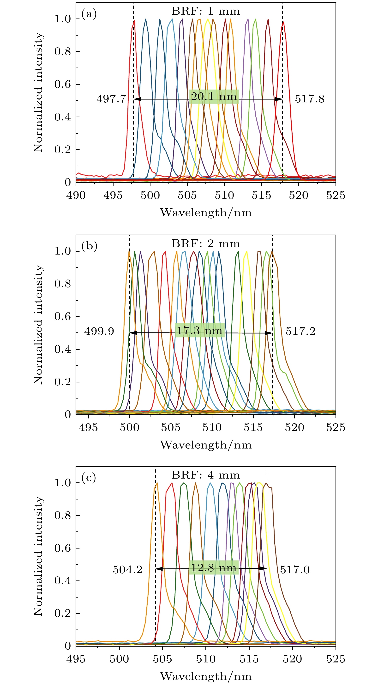 接下来测量了插入非线性晶体LBO后所得倍频绿光的波长可调谐范围. 在上述基频激光调谐实验中, 已经验证3种厚度的BRF均可以实现较宽范围的连续波长调谐. 在此基础上, 首先插入长度为10 mm的LBO晶体, 实现绿光激光输出. 然后, 使用厚度为1, 2, 4 mm的BRF作为调谐元件, 以布儒斯特角插入谐振腔对倍频绿光进行波长调谐. 在TEC设定温度为11 ℃, 泵浦吸收功率为50 W的条件下, 用厚度为1 mm的BRF获得了20.1 nm的最大连续可调谐范围. 如图4(a)所示, 波长在497.7—517.8 nm可调. 采用2, 4 mm的BRF, 分别获得了17.3, 12.8 nm的连续可调谐范围, 如图4(b), (c)所示.