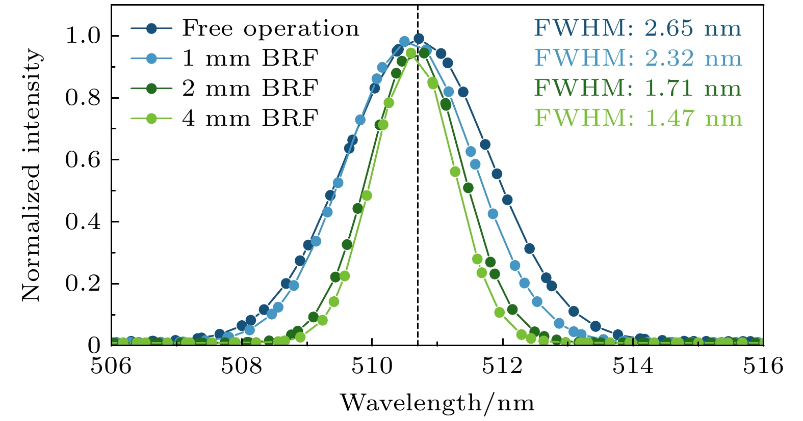 $ \lambda $ 为激光波长,$ \Delta n = {n_{\text{o}}} - {n_{\text{e}}} $ 是o光和e光的折射率差, d为BRF的厚度, BRF越厚压窄线宽效果越好. 图8为VECSEL自由运转及插入不同厚度BRF时输出激光的谱线宽度. 自由运转下509 nm激光的线宽为2.65 nm, 在腔内插入1, 2, 4 mm厚度BRF情况下, 509 nm激光的线宽分别为2.32, 1.71, 1.47 nm, 线宽最大压缩了44.5%. 可以看出, 在谐振腔内使用单个BRF时, BRF的厚度越大, 激光谱线宽度越窄, 与理论相符.结合图5(a)、图6以及图8可知, 3种厚度的BRF并非越薄越好. 从输出功率和调谐范围来看, 相比2 mm厚的BRF, 1 mm厚的BRF带来的腔损耗小, 但是压窄激光线宽的效果差, 对应的输出功率偏低.