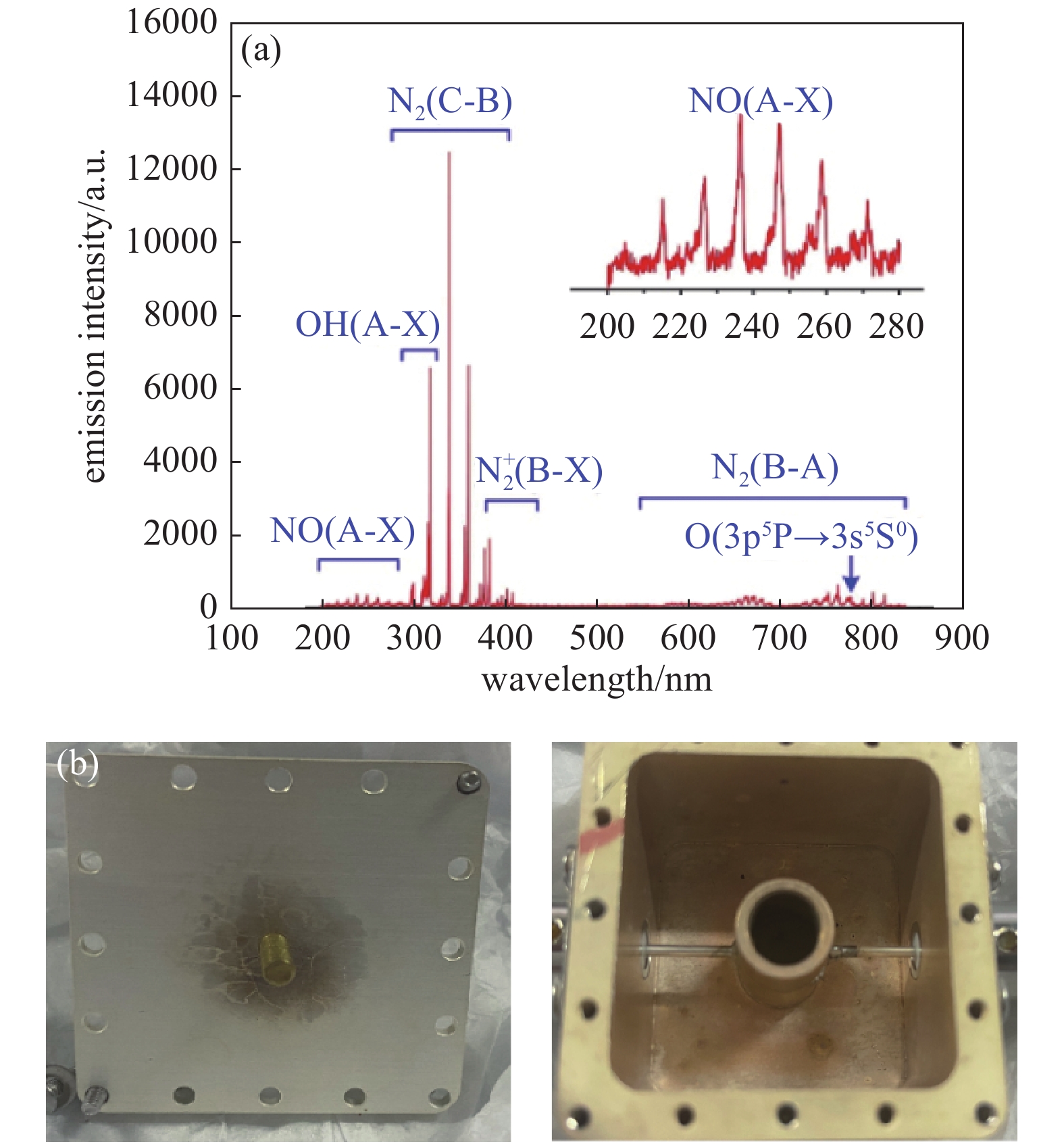 图11(a)展示了空气气氛下气压为500 Pa时谐振腔内放电产生的等离子体的发射光谱,检测结果显示发射光谱主要由氮、氧粒子组成,还包含相当数量的羟基(OH)粒子。这正是因为空气的主要成分为氮气和氧气,通过电子碰撞引起的电离、激发反应以及重粒子之间的反应生成各类产物。此外显著的OH发射谱线也说明等离子体中含有大量的OH粒子[19-20],进一步说明放电气体中存在水分子的掺杂。