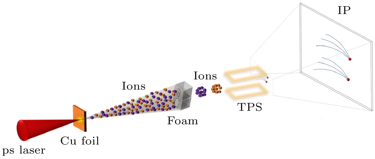Figure 1. Experimental setup. A picosecond laser is focused onto a copper foil, generating an intense carbon ion beam through the TNSA mechanism. The energy spectra of carbon ions passing through the foam target and the empty hole are measured with a dual-channel TPS coupled to the IP.