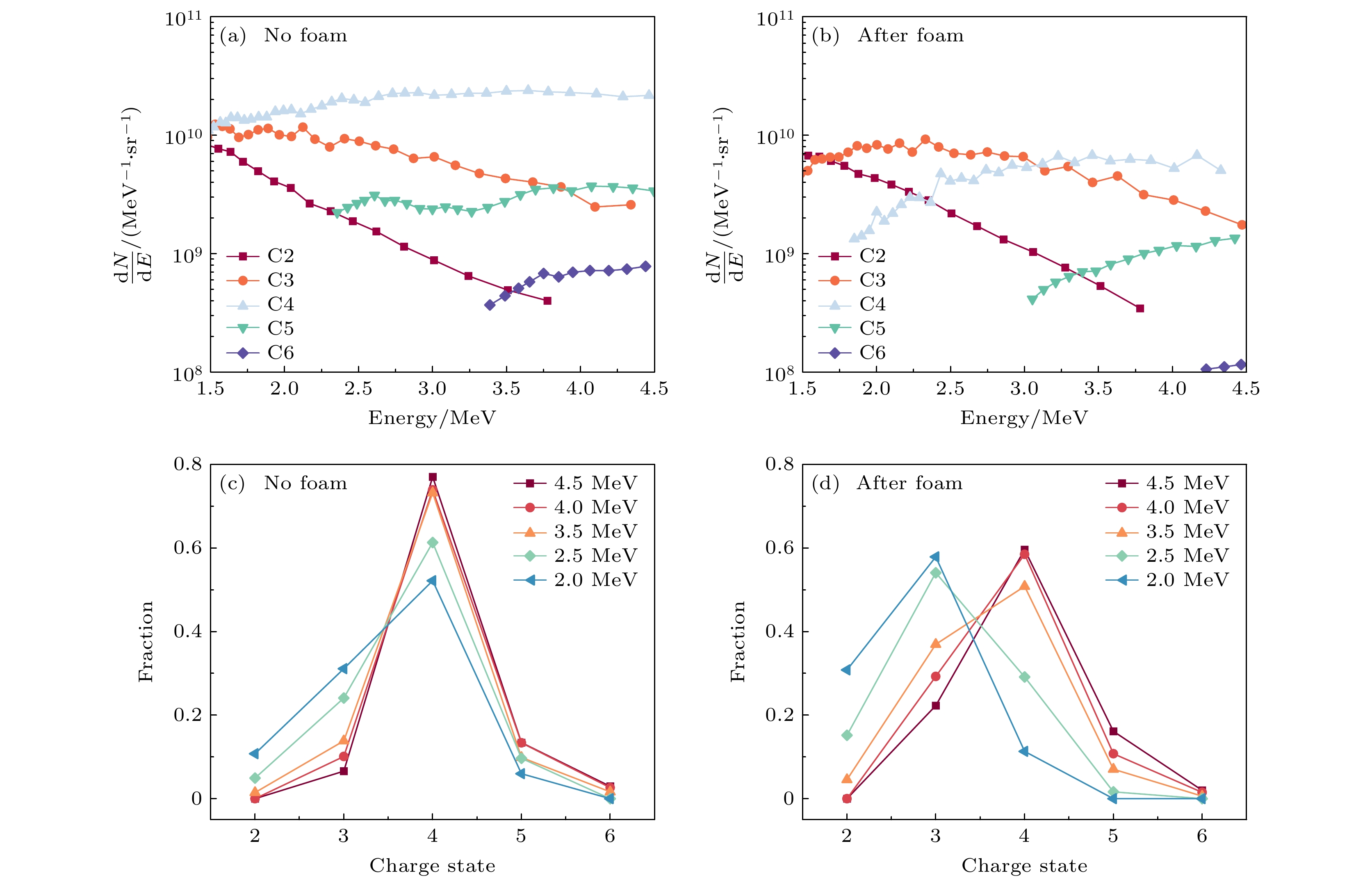 碳离子束穿过空靶和泡沫靶后测得的能谱分布如图2(a), (b)所示, 穿过空靶后的碳离子, 即激光加速产生的初始碳离子包含C6+, C5+, C4+, C3+, C2+多种类离子, 其中C4+离子数目最多. 穿过泡沫靶后的碳离子数目整体降低, 能谱发生明显移动. 离子束穿过空靶和泡沫靶后的电荷分布如图2(c), (d)所示, 其中, 激光TNSA机制加速的碳离子初始电荷态分布主要集中在C4+价态, 激光直接加速出的碳离子在C5+, C2+和C3+离子的占比较小. 在穿过泡沫靶后, 由于靶中原子与碳离子发生复杂的库仑碰撞电离和电子俘获等相互作用, 碳离子的电荷态分布发生明显变化, 主要表现为初始比例最高的C4+离子数目显著减少, 同时更低电荷态的离子(C2+和C3+)占比明显增大, 且离子能量越低, 这种趋势越明显, 原因在于随着离子能量降低, 电子俘获概率增大, 电离概率降低.