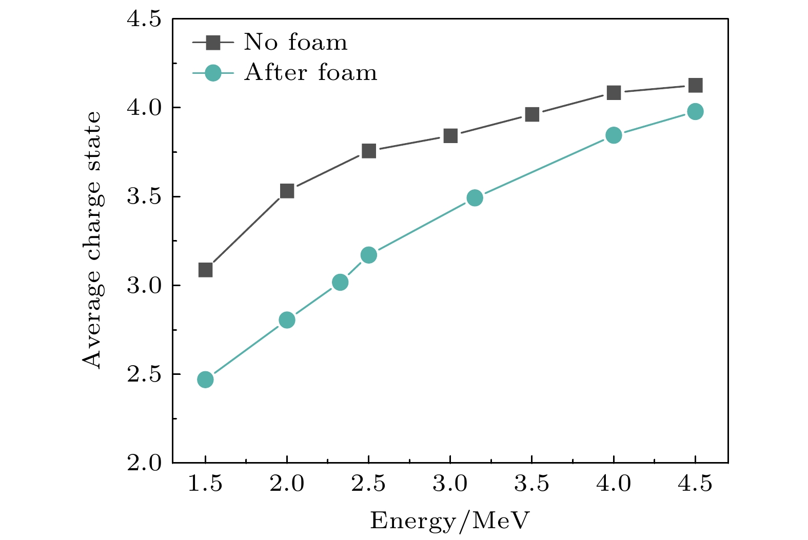 离子在穿过靶物质时的平衡长度一般与离子速度、靶物质密度、离子电荷态等参数有关. 在固体靶中, 离子达到平衡电荷状态所需的长度(或时间)主要是入射离子速度(或能量)的函数. Hattass等[44]实验证明, 离子在固体中的平衡长度约nm量级, 平衡时间在fs量级. 因此, 本文实验测量到的平均电荷态可以合理地认为是出射碳离子的平衡电荷态. 根据碳离子的能谱分布, 图3给出了碳离子穿过空靶和泡沫靶后的平均电荷态
