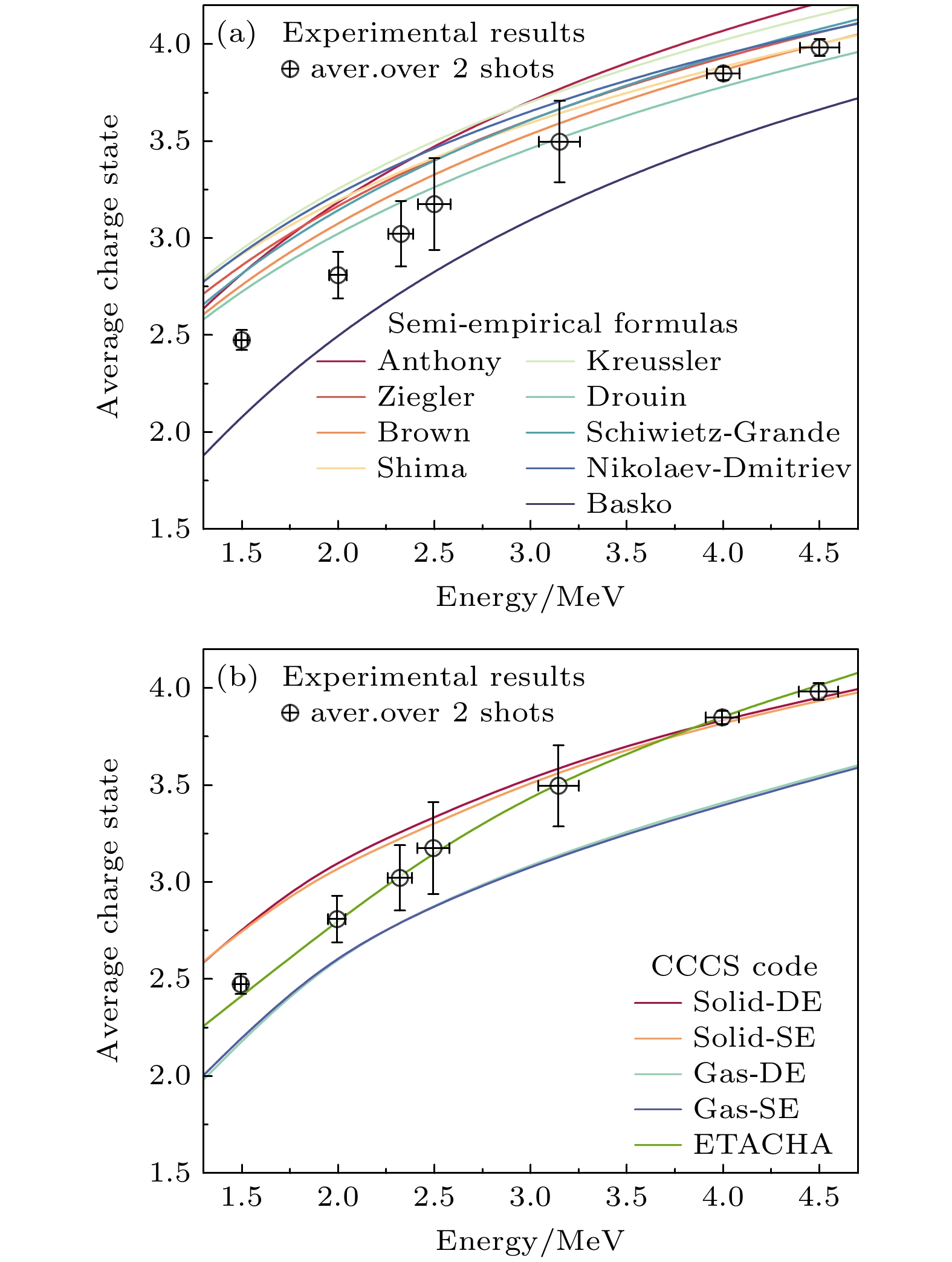 图 4 测量的平均电荷态与理论预测值的比较 (a)与半经验模型比较; (b)与通过求解速率方程得出的预测值的比较. 实验数据是两发次的平均值, 其中能量误差为TPS对各电荷态碳离子能量分辨的最小值, 电荷态误差源于实验统计误差和发次抖动误差