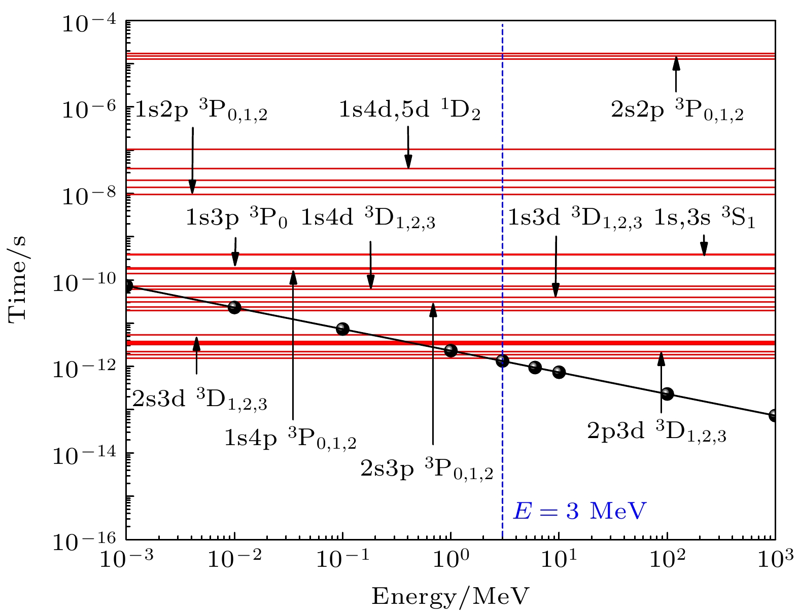 对于本实验当前的碰撞系统, 不同能量C4+离子的激发态寿命和碰撞时间尺度的对比如图5所示, 当入射离子能量大于3 MeV时, 碳离子激发态寿命大于相邻碰撞时间尺度, 靶密度效应起重要作用, 故实验测得的离子平均平衡电荷态与基于固体截面的速率方程解符合较好. 当入射离子能量小于3 MeV时, 碳离子激发态寿命小于相邻碰撞时间尺度, 靶密度效应减弱, 离子电荷降低. 碳离子束穿过泡沫靶后的平均平衡电荷态实验测量值与ETACHA代码[47–49]对比如图4(b)所示, 理论与实验结果整体符合很好, 原因在于该程序对能量大于0.1 MeV/u的入射离子, 充分考虑了离子-原子碰撞中的俘获、电离、激发以及辐射和俄歇退激过程, 进一步验证了激发态对离子电荷交换过程的重要贡献及其与离子能量的依赖关系.
