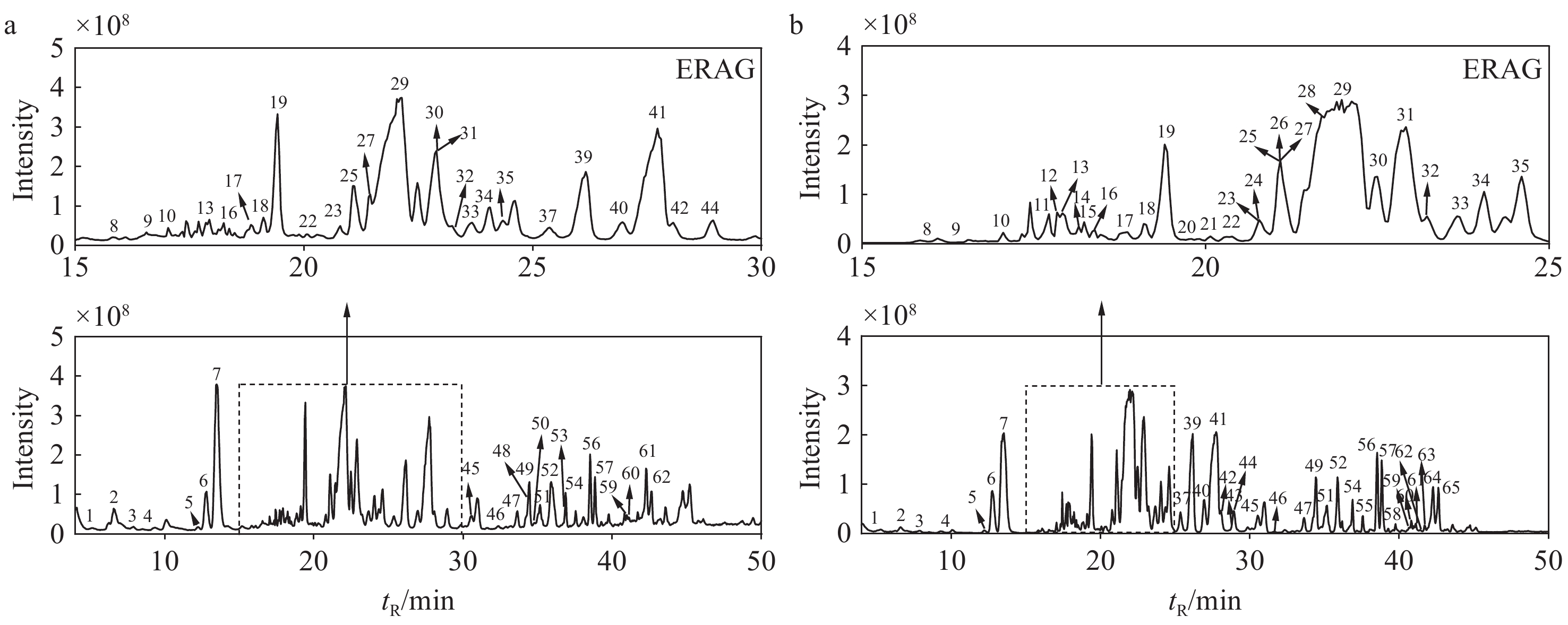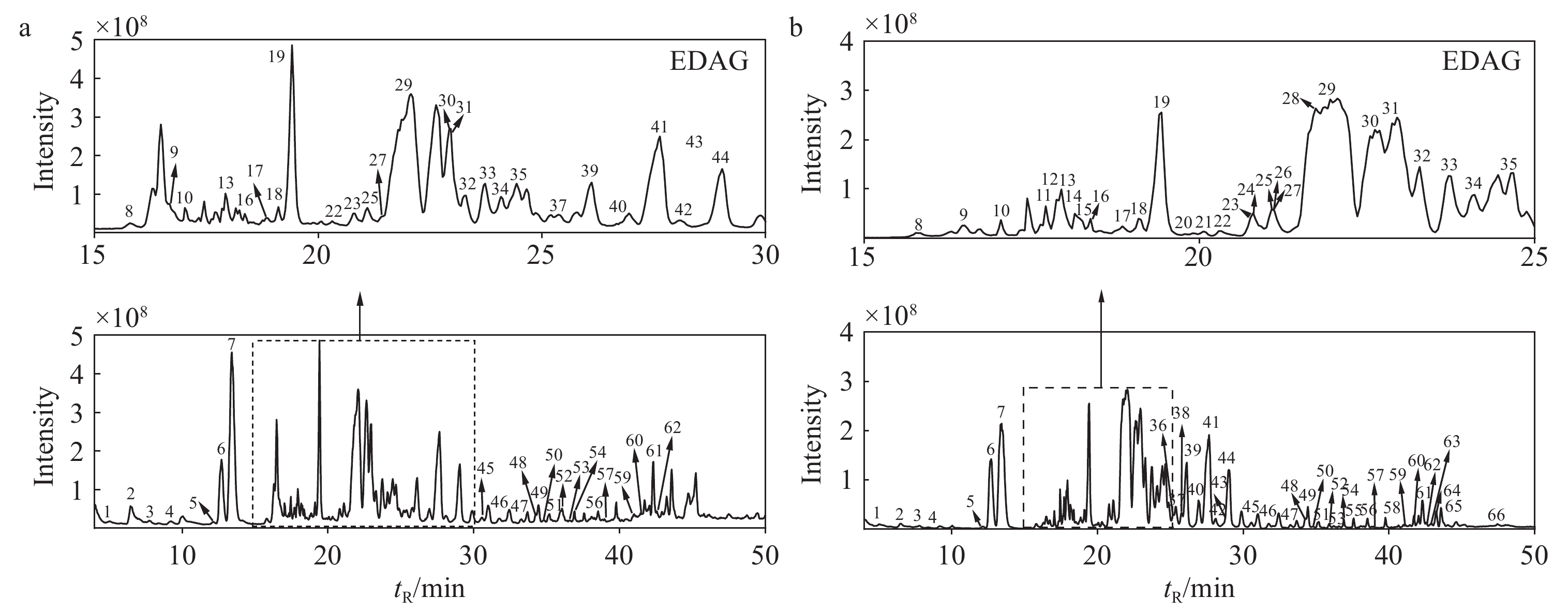 本研究采用UHPLC-Q-Orbitrap-MS/MS技术对生晒西洋参和红西洋参中66种皂苷类成分进行表征,总结正、负离子模式下4种典型皂苷的裂解规律,并通过OPLS-DA模型筛选出生晒西洋参和红西洋参中31种差异性皂苷,包括14种PPD型,11种PPT型,6种其他型。本研究可为西洋参中皂苷的发现提供技术支持,同时为西洋参资源的开发提供理论依据。