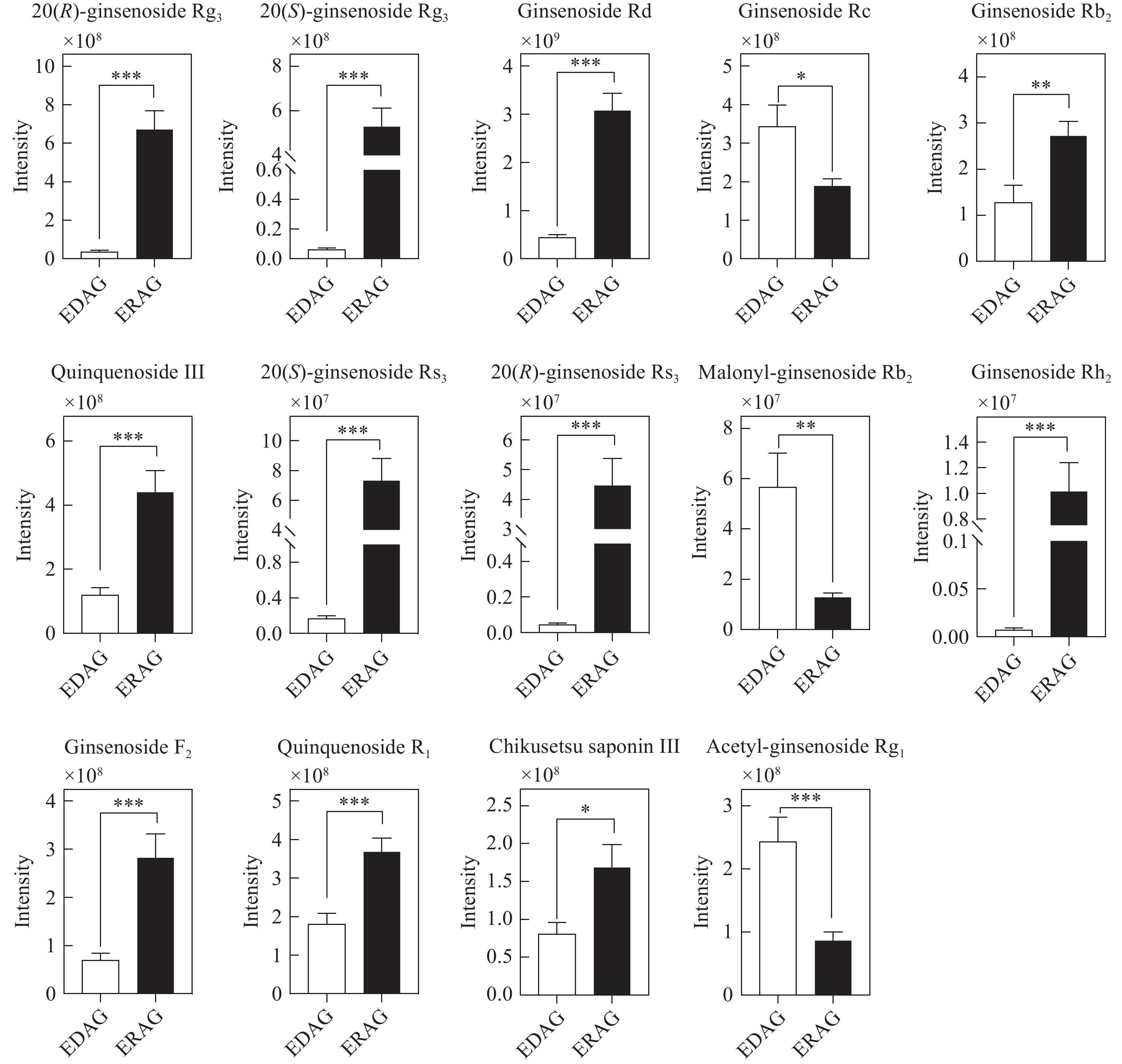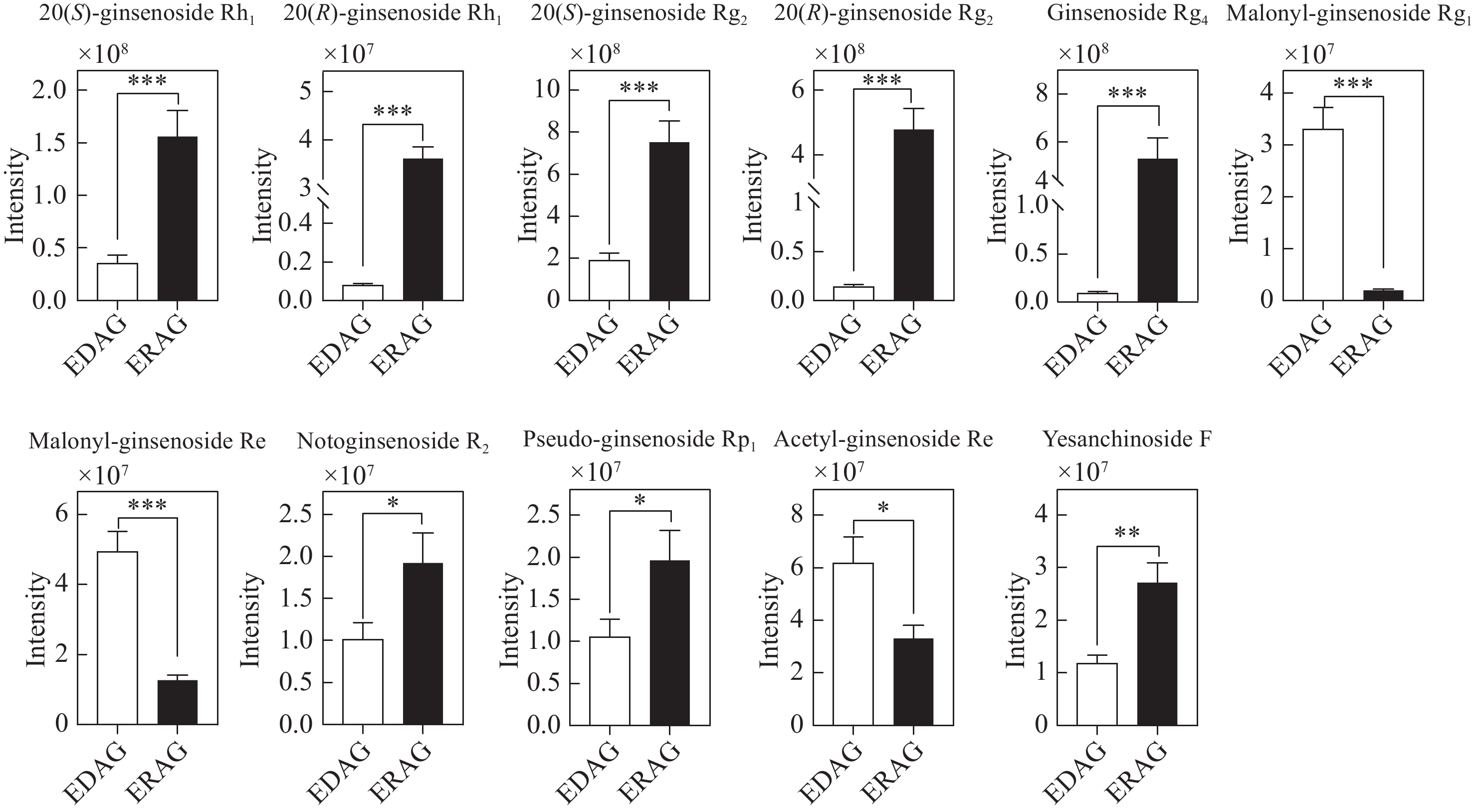 生晒西洋参和红西洋参中原人参三醇型差异皂苷相对含量柱形图示于图11。在筛选鉴定到的11种PPT型差异性皂苷中,丙二酰人参皂苷Rg1、丙二酰人参皂苷Re和乙酰人参皂苷Re在生晒西洋参中含量较高,8种人参皂苷在红西洋参中含量较高,包括人参皂苷Rg2、西洋参皂苷R2等原型皂苷和部分稀有皂苷。