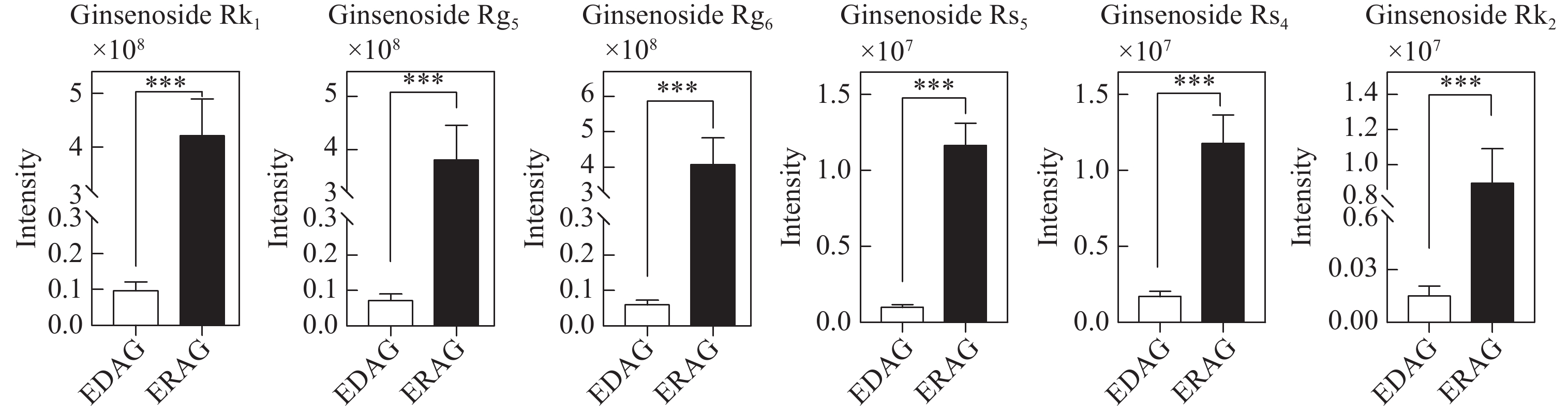 本研究筛选鉴定到的6种其他类型人参皂苷均为稀有皂苷,且均在红西洋参中含量更高,示于图12。