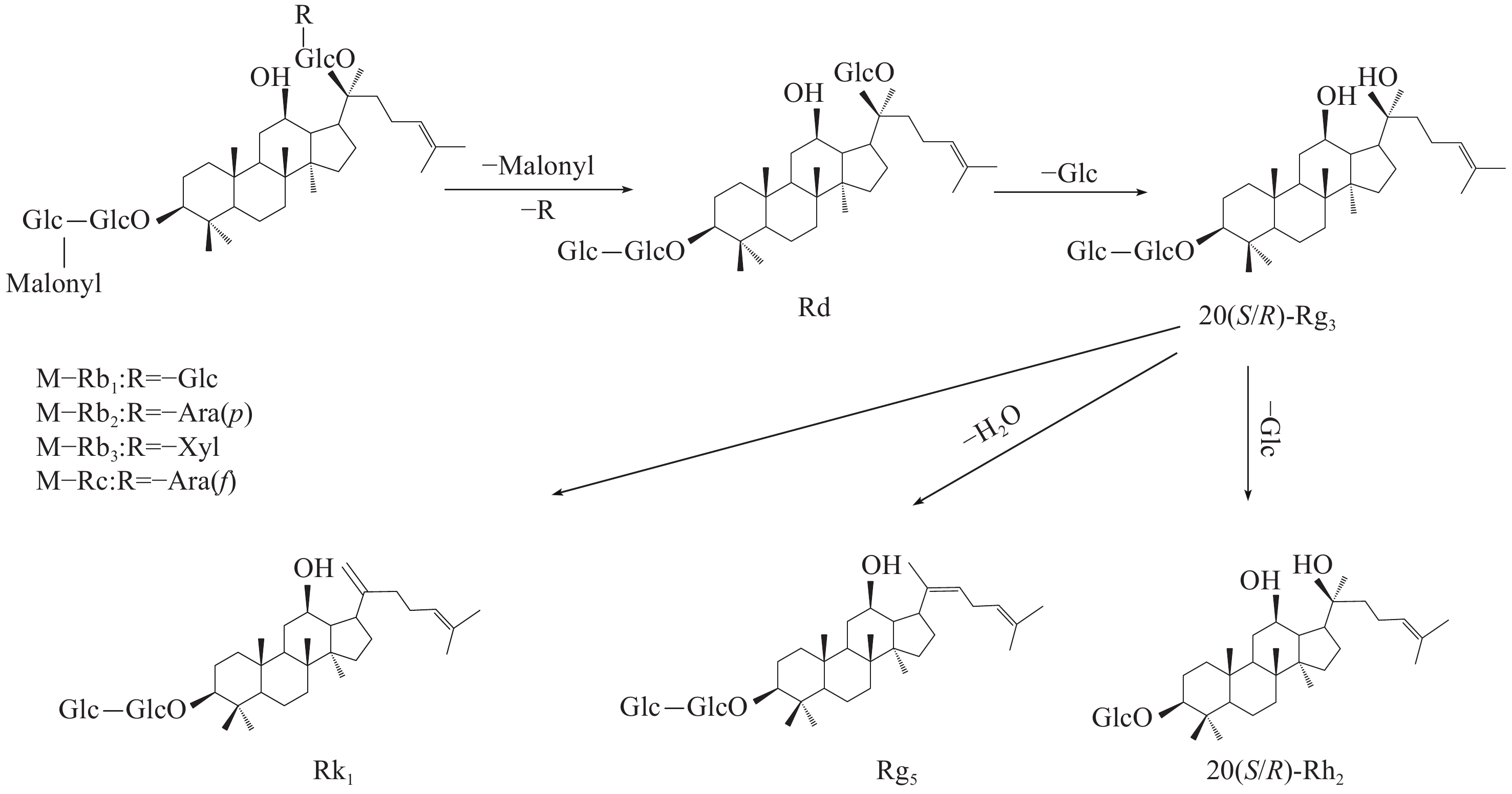 综上所述,乙酰基和丙二酰基取代的人参皂苷在生晒西洋参中含量更高,大部分稀有皂苷在红西洋参中含量更高,造成这种差异的原因是在红西洋参加工过程中,由于温度的影响,水解酶、淀粉酶、麦芽酶等被破坏,阻止皂苷水解,加速了原型皂苷的生物转化[15-19],特别是C-20位上的糖基易发生水解和去糖基化,然后发生异构化或脱水,部分原型皂苷转化为稀有皂苷[20]。此外,高温促进脱乙酰基和去丙二酰基等化学反应。丙二酰人参皂苷Rb2和Rc等可通过脱去C-3位上的丙二酰基和C-20位上的糖基转化为人参皂苷Rg3;人参皂苷Rg3可通过脱去C-3位上1分子葡萄糖转化为人参皂苷Rh2,也可脱去1分子水转化为人参皂苷Rk1和Rg5等稀有皂苷,转化过程示于图13。