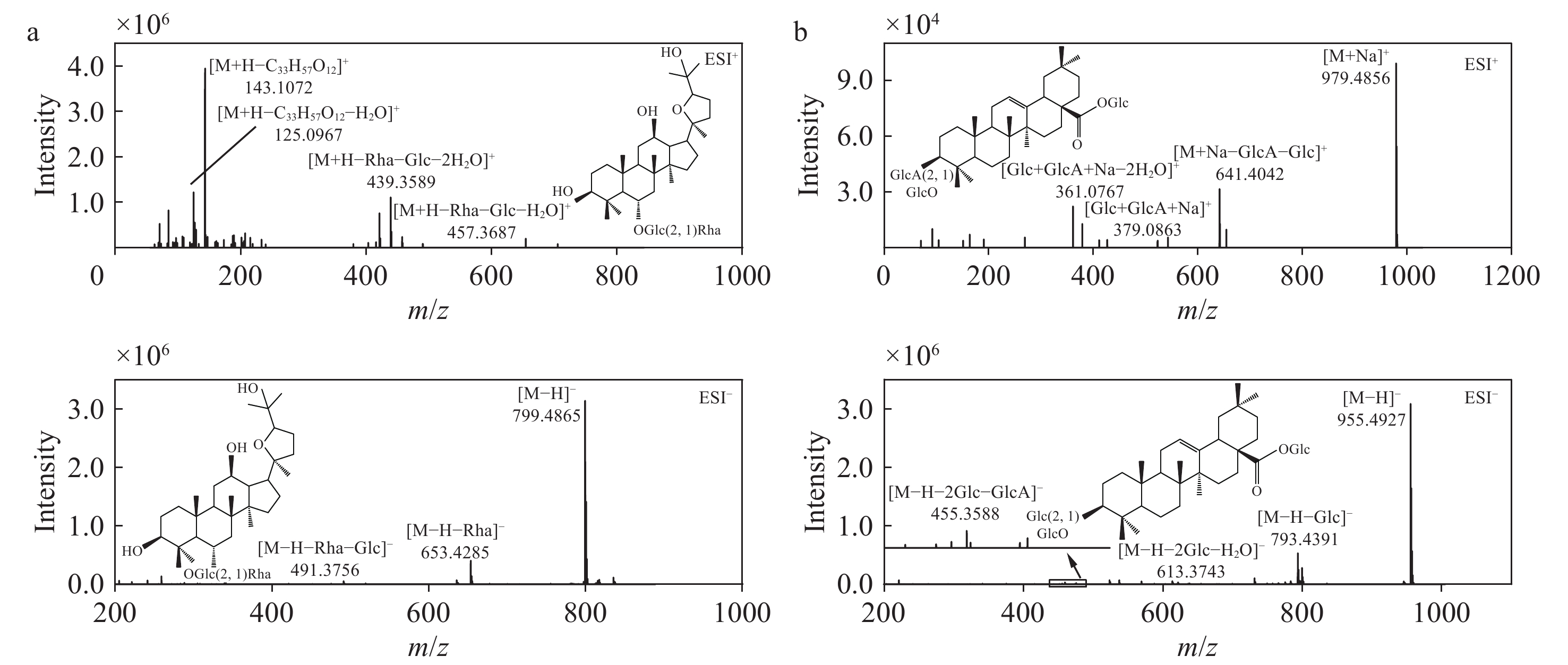 955.4927 [M−H]−,二级质谱中,由于Glc、Glc、GlcA(葡萄糖醛酸)和水分子的丢失,产生了典型的碎片离子m/z793.4391 [M−H−Glc]−、 m/z613.3743 [M−H−2Glc−H2O]−和m/z455.3588 [M−H−2Glc−GlcA]−,其中m/z455.3588 为OA型皂苷苷元的特征碎片离子。正离子模式下,一级质谱出现准分子离子峰m/z979.4856 [M+Na]+,m/z641.4042 和m/z379.0863 作为1对互补离子,分别为脱去1分子葡萄糖和1分子葡萄糖醛酸的[M+Na−Glc−GlcA]+碎片离子和二糖的钠加合离子[Glc+GlcA+Na]+,m/z361.0767 为[Glc+GlcA+Na−2H2O]+碎片离子。 -