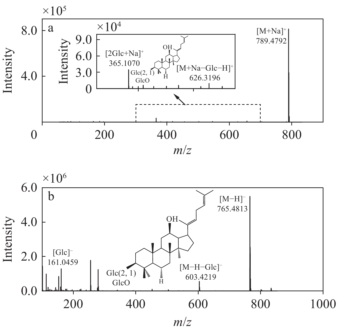 765.4813 为[M−H]−离子,丢失1分子葡萄糖残基生成m/z603.4219 [M−H−Glc]−碎片离子,此外,还出现m/z161.0459 [Glc]−碎片离子。正离子模式下,人参皂苷Rg5一级质谱出现准分子离子峰m/z789.4792 [M+Na]+,m/z626.3196 为[M+Na−Glc−H]+碎片离子,m/z365.1070 为二糖的钠加合离子[2Glc+Na]+。 -