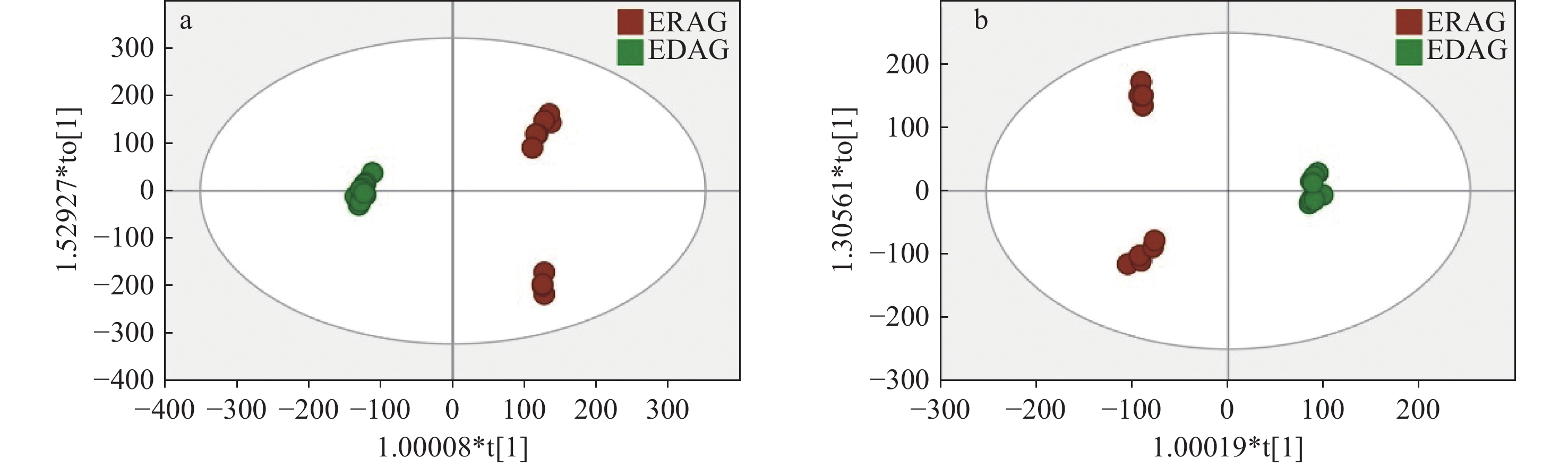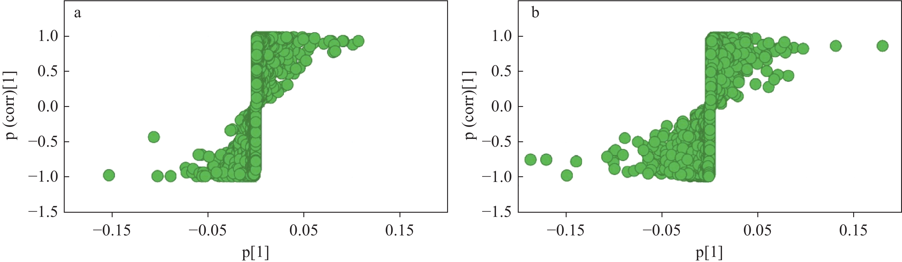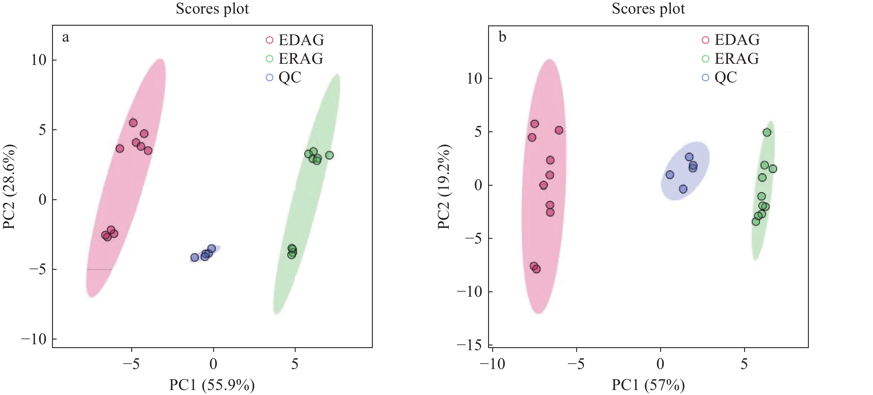在正、负离子模式下,生晒西洋参和红西洋参的PCA得分图示于图6。可见,2组样本完全分离,表明生晒西洋参和红西洋参之间存在显著差异;QC样本相对集中,表明仪器稳定性良好。