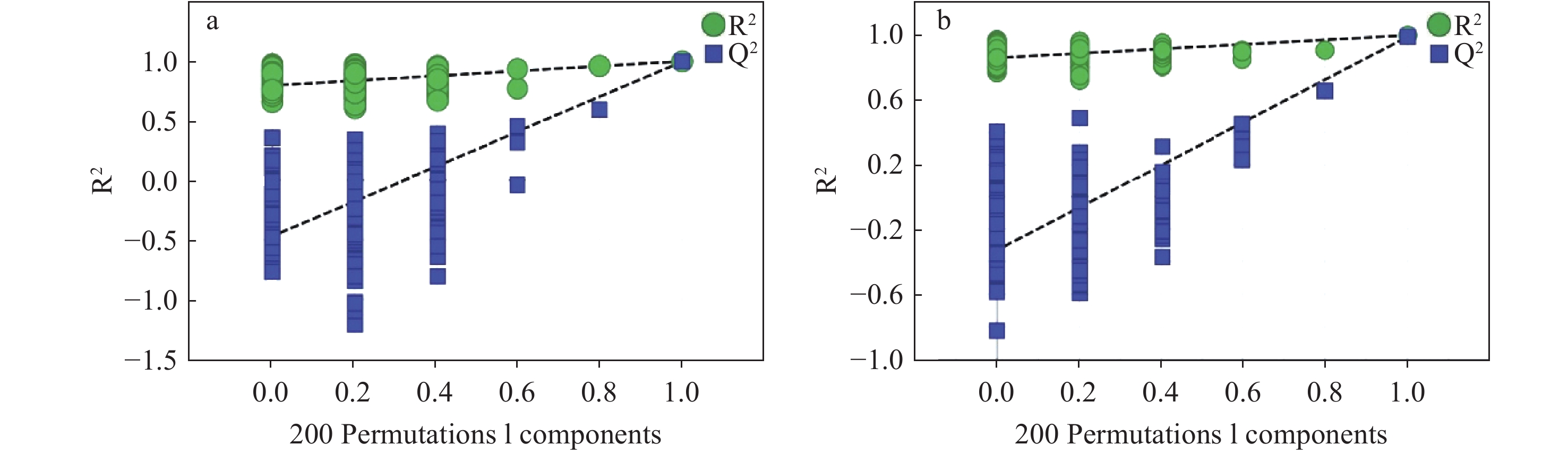 为进一步分析2组间化合物的差异信息,对2组数据进行有监督的OPLS-DA,结果示于图7。在正、负离子模式下,生晒西洋参和红西洋参均分离良好,分布在左右两侧,表明两者存在显著差异。OPLS-DA模型参数显示,正离子模式下,R2Y为0.997,Q2为0.992,负离子模式下,R2Y为0.996,Q2为0.986,表明所建立的模型具有良好的拟合度和较高的可预测性。置换检验(n=200)结果示于图8,Q2回归线在Y轴上的截距均小于0,模型稳定,未出现过拟合。