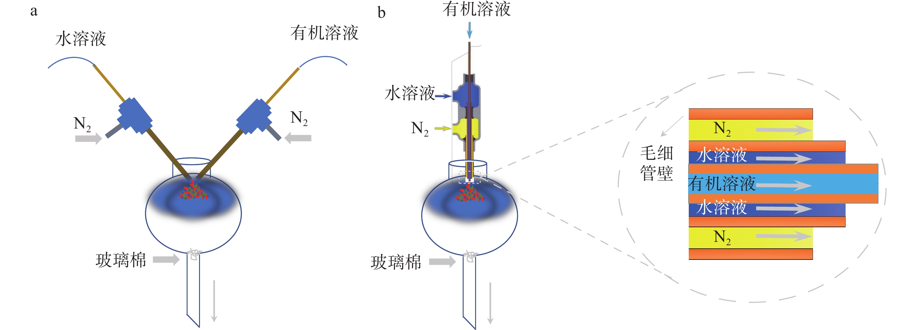 近几十年来,基于电喷雾质谱的微液滴化学已成为各种化学反应的便捷平台[9]。微液滴具有独特的物化性质,如反应物在微液滴-气体界面附近的部分溶剂化、微液滴的极端pH值、溶剂的快速蒸发及原料局部浓度提升、界面附近的特殊电场,以及增强的传质过程等[10]。近期,南开大学张新星研究员、杭州师范大学程和勇教授、斯坦福大学Zare教授、普渡大学Cooks教授、德州农工大学严昕教授等在微液滴化学性质方面的研究进展[11-15],进一步揭示了微液滴化学技术的重要作用。分子在液相和气相中反应速率的数量级差异,归因于反应分子的溶剂化[16]。作为部分溶剂化典型代表的微液滴体系,其反应过程的能垒显著低于本体溶液[17]。因此,微液滴中的反应可被加速至本体溶液的101~105倍,反应产率也能大幅提高[18-20]。2017年[21],严昕和Zare采用基于电喷雾萃取电离(EESI)原理的双液路非同轴微液滴技术(图1a),在无相转移催化剂的情况下,实现了不混溶两相中亲水的次氯酸钠氧化疏水的苄醇制备醛或酮(产率为50%~75%)。综上所述,微液滴化学技术在促进不混溶两相液-液界面反应、提高反应速率和产率等方面,展现出巨大潜力。