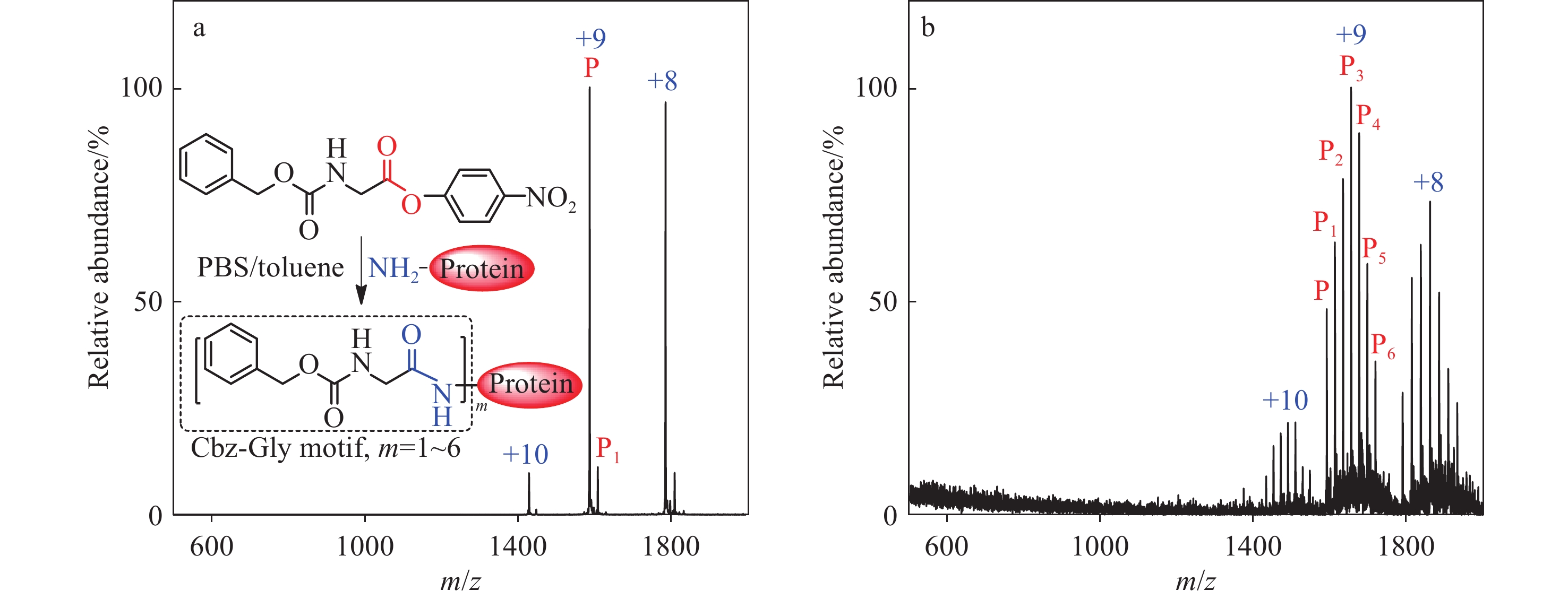 从表1可知,在微液滴体系中,含有大疏水基团的活性酯类(Ea、Eb、Ec、Ed、Ee和Ef)可以有效地与P的氨基发生氨解反应,相对转化率为65%~91%,且得到的产物蛋白Pa、Pb、Pc、Pd、Pe和Pf(产物蛋白的核心结构示于图3e)均可检测到3~6个疏水基团与对应产物蛋白形成共价偶联。然而,在常规本体溶液体系中,Ea、Eb、Ec、Ed、Ee和Ef与蛋白P氨解共价偶联的相对转化率较低,均不超过11%。以带9个正电荷的蛋白质分子离子峰为例,相对离子强度≥30%的分子离子只有模型蛋白的离子峰m/z