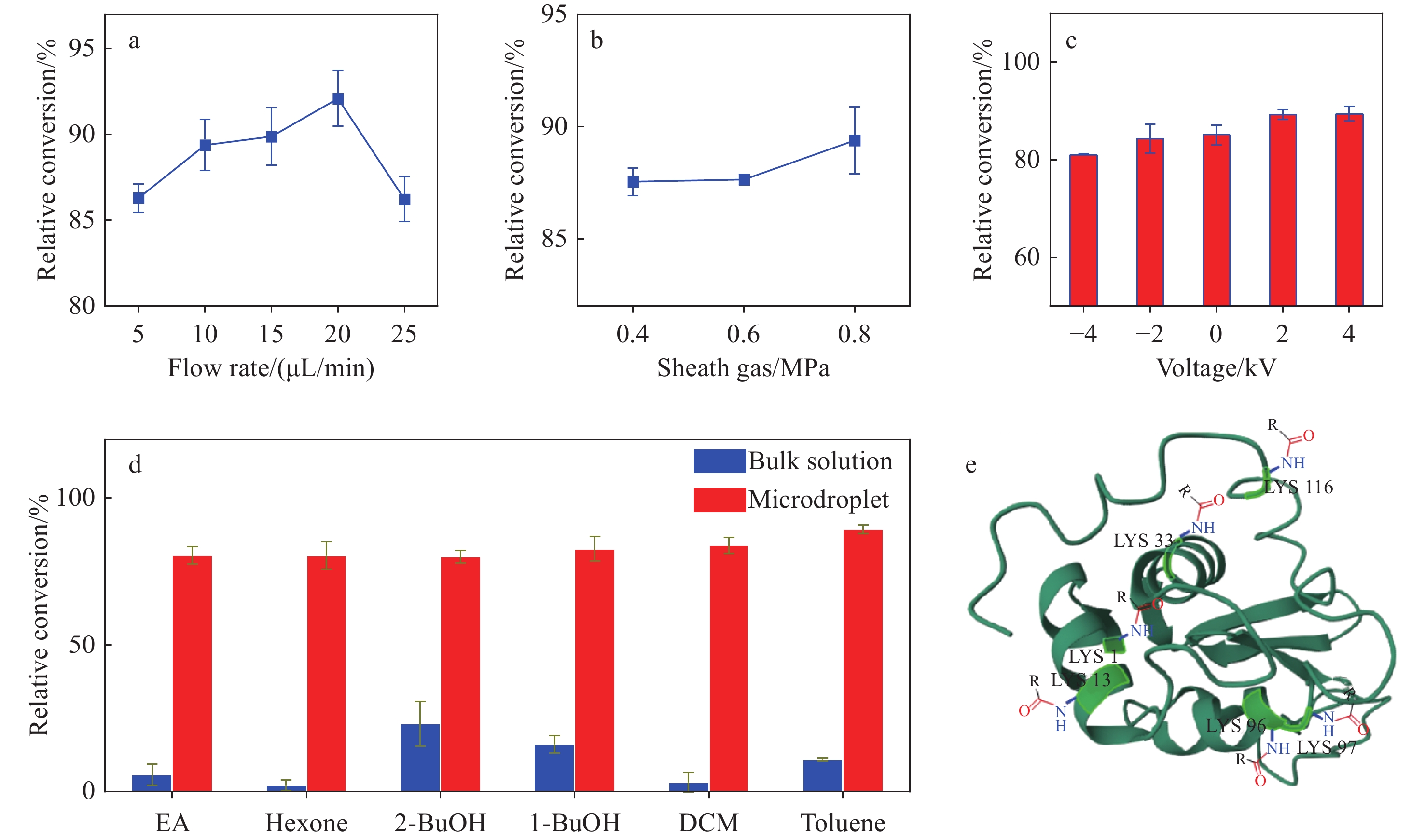 图 3 不混溶两相微液滴体系中Ea与模型蛋白P氨解反应的溶液流速(a)、雾化气体压强(b)、电压(c)和溶剂种类条件(d)的优化,以及产物蛋白结构图(e)