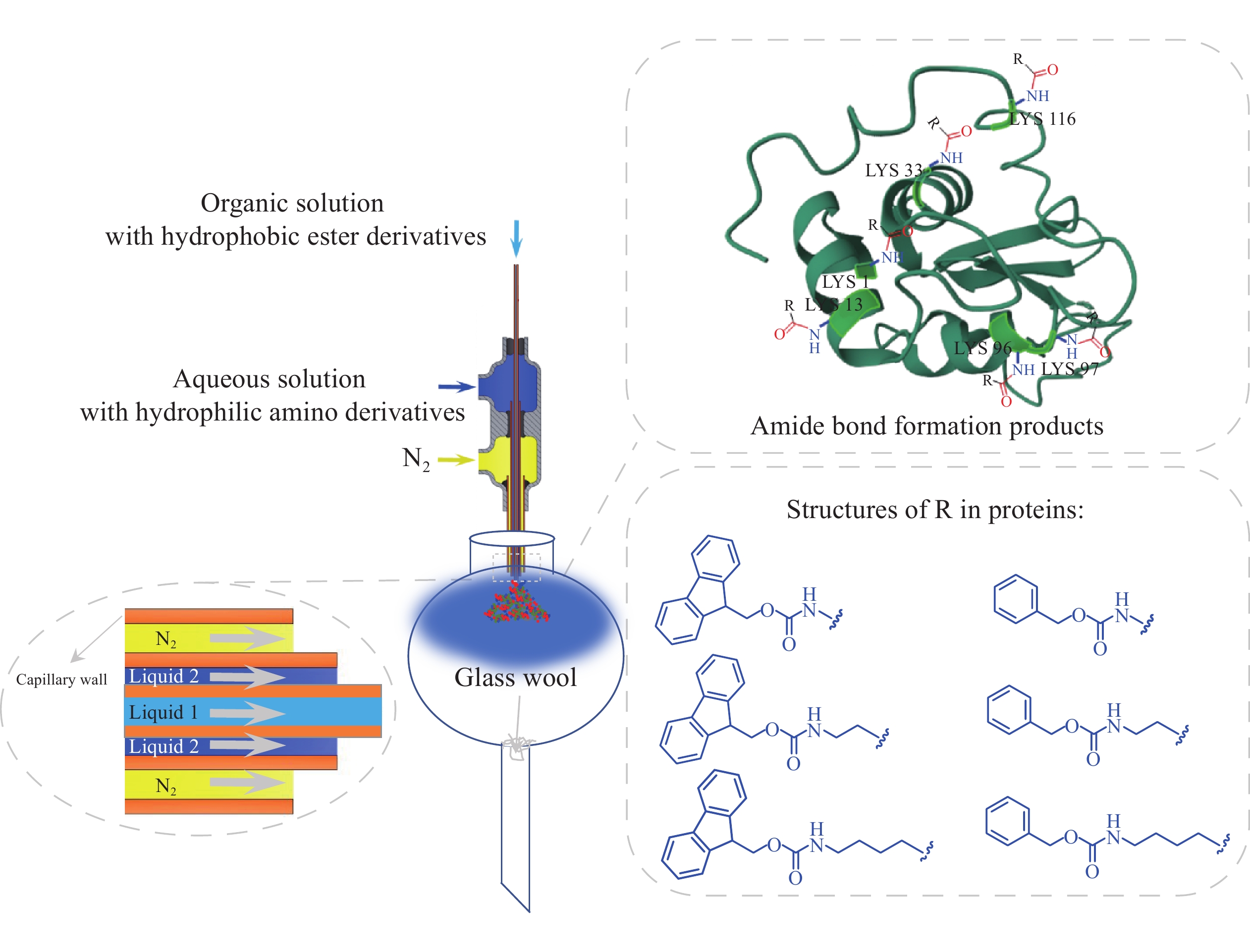 针对无相转移催化剂时不混溶两相间酰胺键构建过程中的瓶颈问题,利用微液滴化学技术优势,设计组装了可促进不混溶两相间液-液界面充分接触的微液滴反应装置,实现了两相间物质的共价偶联及产物收集,并结合质谱技术,快速监测分析微液滴中不混溶两相间反应。以疏水小分子酯与亲水多肽的氨基氨解形成酰胺键的反应作为微液滴中不混溶两相间反应的模型,阐明微液滴中传质方式、微液滴尺寸、电场强度、溶剂极性等因素对不混溶两相间界面的影响,成功实现了无相转移催化剂时两相中亲水分子与疏水分子的高效偶联,为不混溶两相中亲水蛋白与疏水分子间无需相转移催化剂的高效偶联提供了新方法。