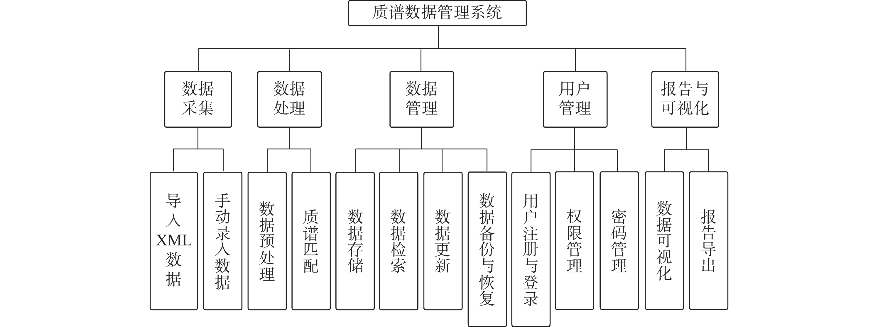 基于对系统需求的深入分析,考虑到开发效率、运行成本以及终端用户的操作便捷性,采用Python编程语言进行开发。此外,本系统选用轻量级的MySQL作为数据库管理系统,以保证数据处理的高效性和可扩展性。为进一步提升用户交互体验,使用功能强大的PyQt框架设计图形用户界面。质谱数据管理系统的具体功能模块示于图2。