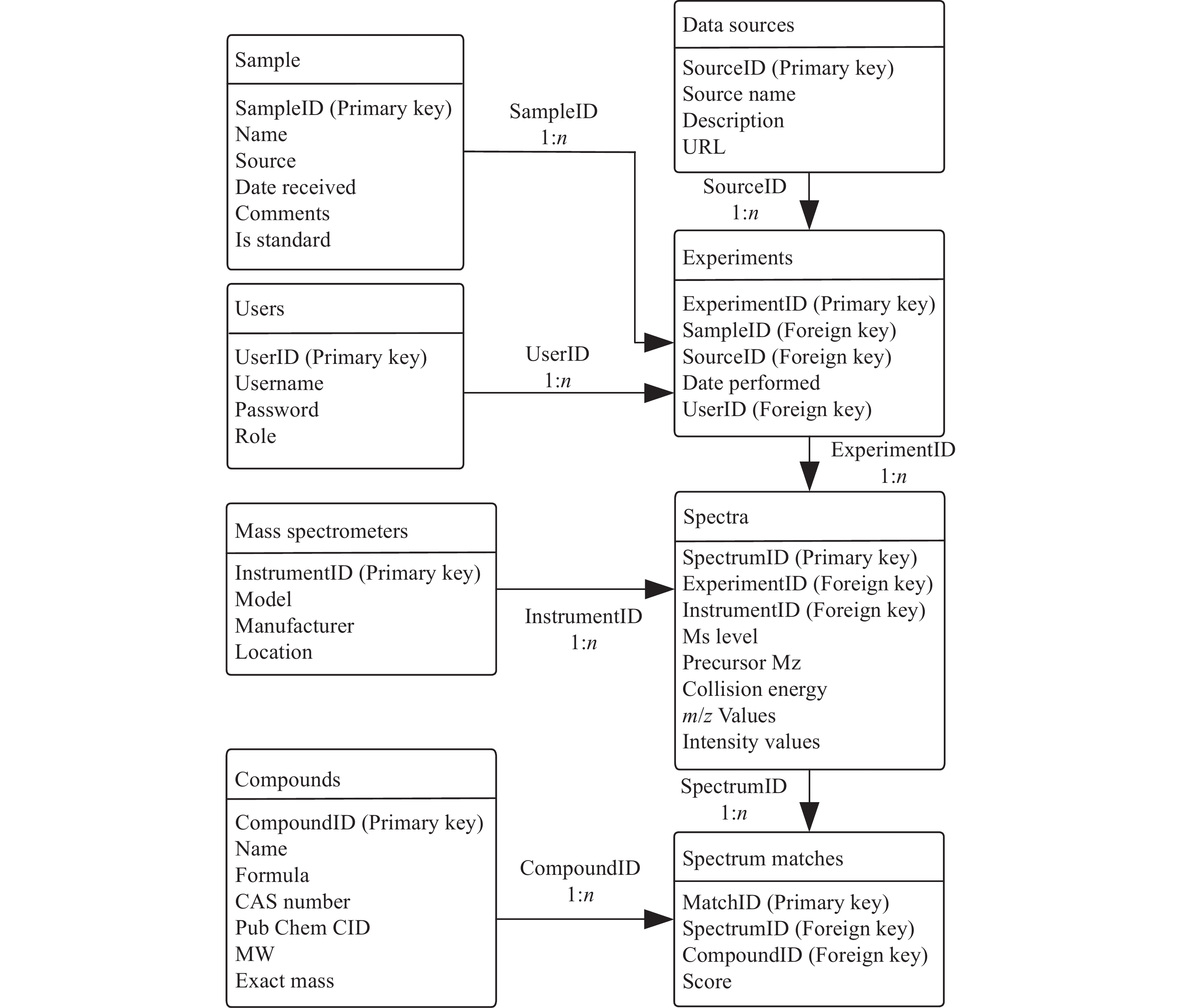 在质谱数据管理系统中,核心实体包括实验记录、样品信息、化合物信息、质谱数据、实验仪器及用户,这些实体通过明确的关系相互关联。例如,数据来源、样品和用户分别与实验记录呈一对多的关系,一个数据来源可设计多个实验,质谱仪可用于生成多张谱图,谱图、化合物与匹配结果均为一对多的关系。该设计清晰地呈现了实体间的内在关系,支持复杂数据的高效管理。