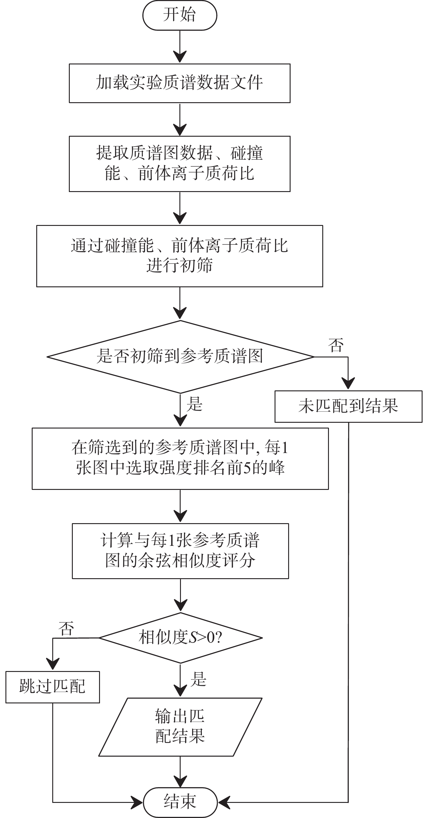 首先,加载未知化合物的质谱数据文件,解析并提取文件中的谱图数据、碰撞能和前体离子m/z等信息;然后,根据碰撞能和前体离子m/z设定的阈值范围,初步筛选出参考质谱图,以消除不同仪器和实验条件带来的误差,提高匹配效率和准确性。提取实验质谱图和参考质谱图的前5个峰值作为匹配的关键特征峰,基于余弦相似度算法,计算两者的余弦相似度评分,返回相似度大于40%且排名前5的数据。质谱匹配算法流程示于图4。