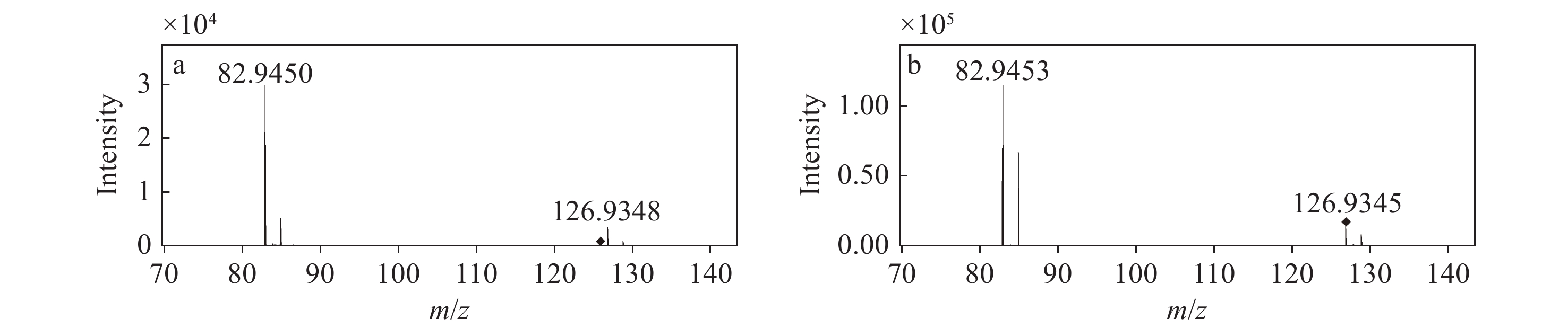 在ESI−模式下,固定液相色谱条件并进样分析,首先进行母离子扫描,根据离子信号强度选出9种卤代乙酸的目标母离子,经m/z推测9种母离子形式均为[M−H]−;然后对母离子施加一定的碰撞能量获得碎片离子,其中DCAA和TCAA的子离子碎片分别为m/z 82.9和116.9[34]。利用卤代乙酸的标准质谱数据库对采集的加标样品进行筛查鉴定,部分筛查结果列于表6。可知,实测值与理论值的质量误差较小,余弦相似度接近100%,表示它们高度相似,均符合匹配参数,表明该样品中含有DCAA和TCAA。