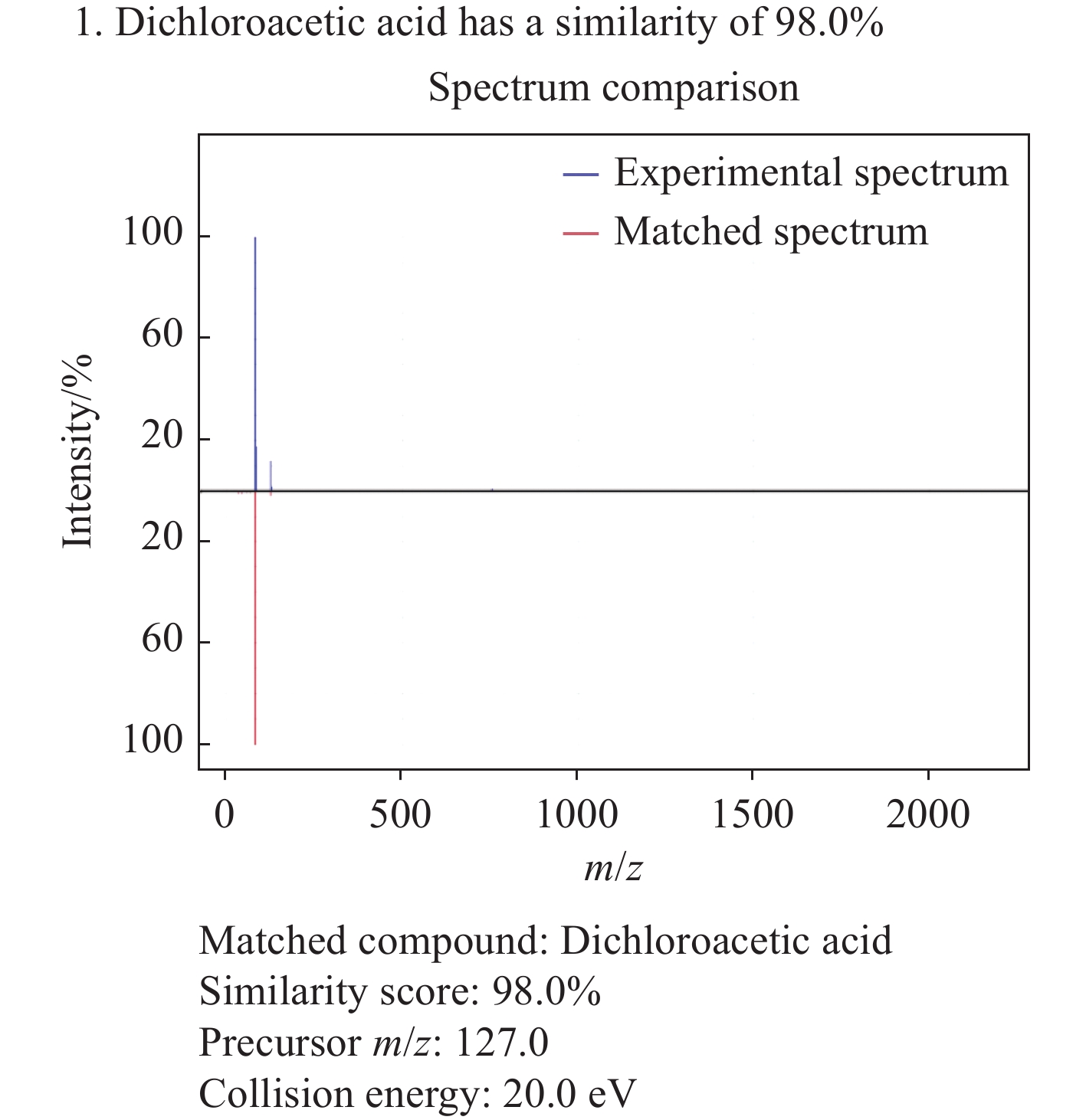 Fragment ion (m/z)1 二氯乙酸 C2HCl3O2 [M−H]− 126.9348 82.9450, 84.9419 2 三氯乙酸 C2H2Cl2O2 [M−H]− 160.8931 116.9043, 118.9016 表 6 二氯乙酸、三氯乙酸的筛查结果