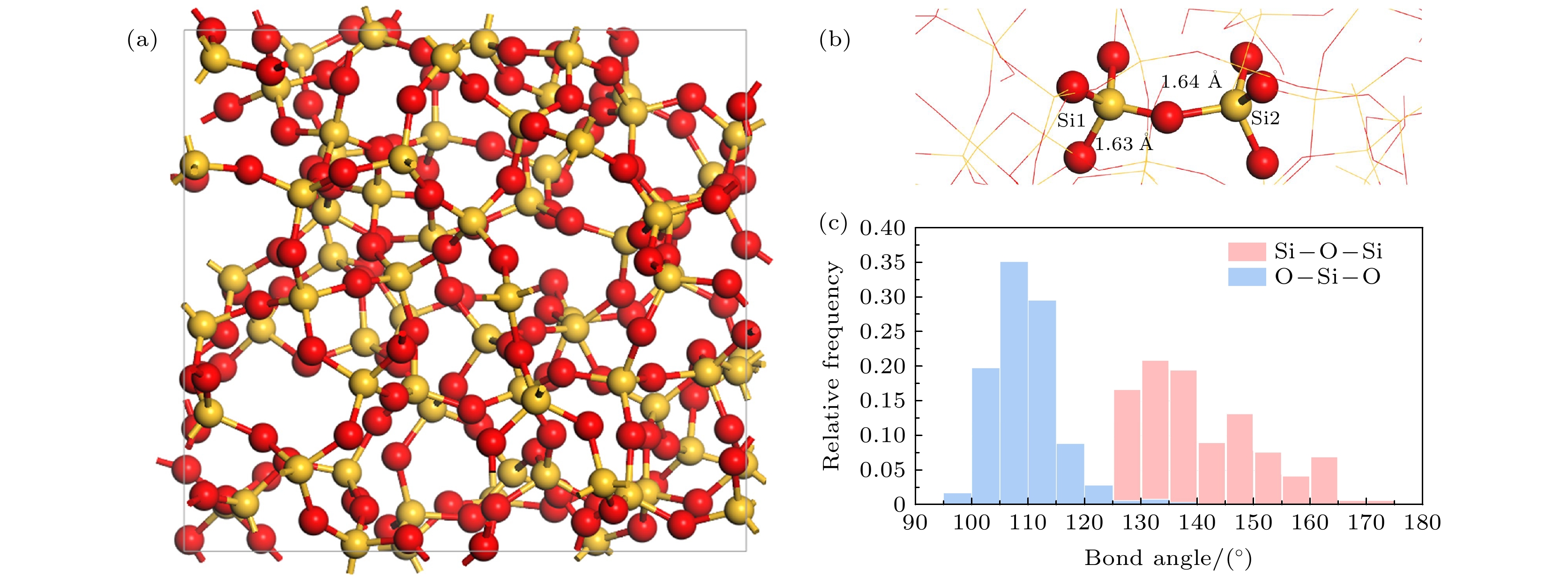 本文所采用的无缺陷a-SiO2模型含有216个原子, 该模型通过分子动力学模拟升温和退火过程生成[27], 其Si—O—Si 键角介于120°—180°之间, O—Si—O 键角分布在95°—135°. 氧原子两侧的Si—O键长存在差异, 为方便讨论, 将具有较短Si—O键长的硅原子标记为Si1, 较长的硅原子标记为Si2, 相应的平均Si—O键长分别为1.63 Å和1.64 Å, 如图1所示. 此外, 基于本原环判据[61-63]对该模型硅原子环分布进行统计, 结果显示六元环和七元环占主导且未观察到二元环, 说明该模型符合非晶结构特征[64].