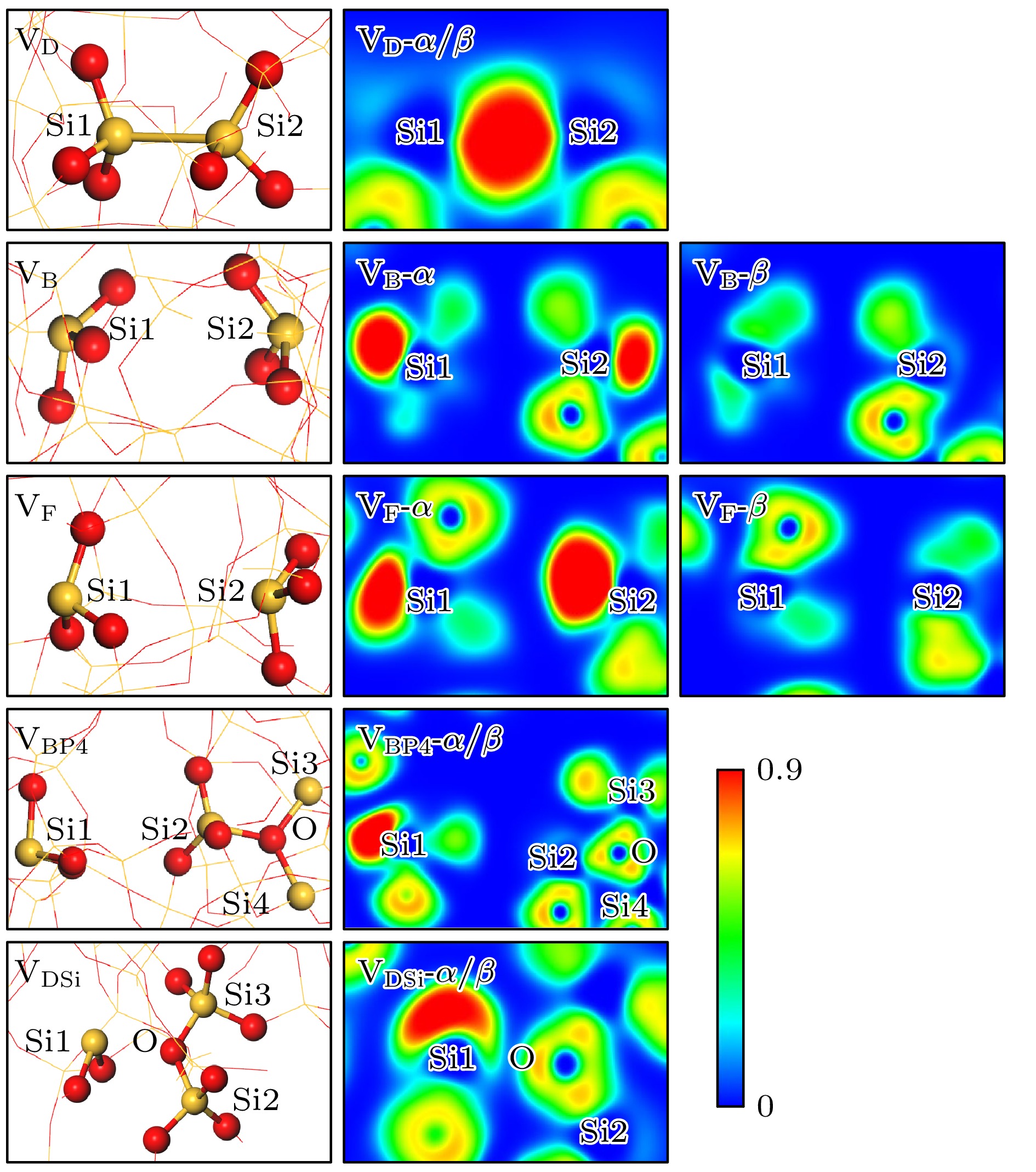 $ {\mathrm{V}}_{\mathrm{D}} $ )、后向构型($ {\mathrm{V}}_{\mathrm{B}} $ )、前向构型($ {\mathrm{V}}_{\mathrm{F}} $ )、后向四配位褶皱构型($ {\mathrm{V}}_{\mathrm{B}\mathrm{P}4} $ )和二价硅构型($ {\mathrm{V}}_{\mathrm{D}\mathrm{S}\mathrm{i}} $ ), 其典型结构和ELF图如图2所示(悬挂键上含有电子的自旋方向为α, 不含电子的自旋方向为β ).$ {\mathrm{V}}_{\mathrm{D}} $ 构型的结构特征表现为缺陷处的两个硅原子通过共价键形成二聚体, 其Si1-Si2二聚体的平均键长为2.42 Å, 较晶体硅中的Si—Si键长仅增加了3%. ELF分析显示, 在移除氧原子后, Si1和Si2的悬挂键重新键合, 导致二者未成对电子形成配对, 并分布在两个自旋方向上. 受到Si1—Si2共价键的影响, 缺陷处平均O—Si—O键角偏离理想四面体的键角(109.5°), 平均Si—O键长增加至1.66 Å, 如表1所列. 尽管存在氧空位缺陷, 硅氧原子仍维持接近理想四面体的杂化状态, 表明缺陷未显著破坏局域共价键网络. 与$ {\mathrm{V}}_{\mathrm{D}} $ 构型相比,$ {\mathrm{V}}_{\mathrm{F}} $ 和$ {\mathrm{V}}_{\mathrm{B}} $ 构型中Si1和Si2均存在悬挂键, 显著增加了反应的活性位点, 其中$ {\mathrm{V}}_{\mathrm{F}} $ 构型中的两个悬挂键分别指向氧空位及其反方向, 而$ {\mathrm{V}}_{\mathrm{B}} $ 构型的悬挂键则均指向氧空位反方向. 两种构型中的未成对电子仅分布在单一自旋方向上, 并且Si—O键长和O—Si—O键角具有相似的结构参数. 两种构型的O—Si—O键角值均略大于$ {\mathrm{V}}_{\mathrm{D}} $ 构型, 表明其未成对电子对Si—O键的排斥作用要弱于二聚体结构. 虽然$ {\mathrm{V}}_{\mathrm{D}}, {\mathrm{V}}_{\mathrm{F}} $ 和$ {\mathrm{V}}_{\mathrm{B}} $ 三类构型存在结构差异, 但Si1和Si2均表现出明显的sp3杂化特征.在褶皱构型
