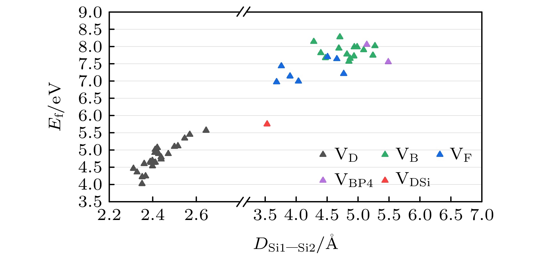 $ E_{\mathrm{\mathit{f}}} $ 随Si1与Si2间距$ {D}_{\mathrm{S}\mathrm{i}1-\mathrm{S}\mathrm{i}2} $ 的变化如图3所示. 可以看出,$ {\mathrm{V}}_{\mathrm{D}} $ 构型具有较低的$ E_{\mathrm{{f}}} $ , 表明其在a-SiO2制备或者辐照过程中更容易出现. 相比之下, 褶皱构型$ {\mathrm{V}}_{\mathrm{B}\mathrm{P}4} $ 以及$ {\mathrm{V}}_{\mathrm{F}} $ 和$ {\mathrm{V}}_{\mathrm{B}} $ 构型的形成需要更高的能量, 在a-SiO2中缺陷密度相对较低. 总体上,$ E_{\mathrm{{f}}} $ 与$ {D}_{\mathrm{S}\mathrm{i}1-\mathrm{S}\mathrm{i}2} $ 具有显著的正相关性(Person相关系数为0.96). 在之前对正电性氧缺陷的研究中发现,$ {D}_{\mathrm{S}\mathrm{i}1-\mathrm{S}\mathrm{i}2} $ 的增大会促使体系通过形成褶皱或双褶皱构型来维持缺陷的稳定性并释放局部应力[65,66],$ E_{\mathrm{{f}}} $ 随着$ {D}_{\mathrm{S}\mathrm{i}1-\mathrm{S}\mathrm{i}2} $ 的增加呈现先增大后减小的趋势, 拐点出现在约4.5 Å处[27]. 在本研究中, 尽管未观察到$ E_{\mathrm{{f}}} $ 的明显拐点, 但并不排除中性氧空位缺陷也可能具有类似的变化趋势, 即$ {D}_{\mathrm{S}\mathrm{i}1-\mathrm{S}\mathrm{i}2} $ 也是影响中性氧缺陷$ E_{\mathrm{{f}}} $ 的重要因素之一. -