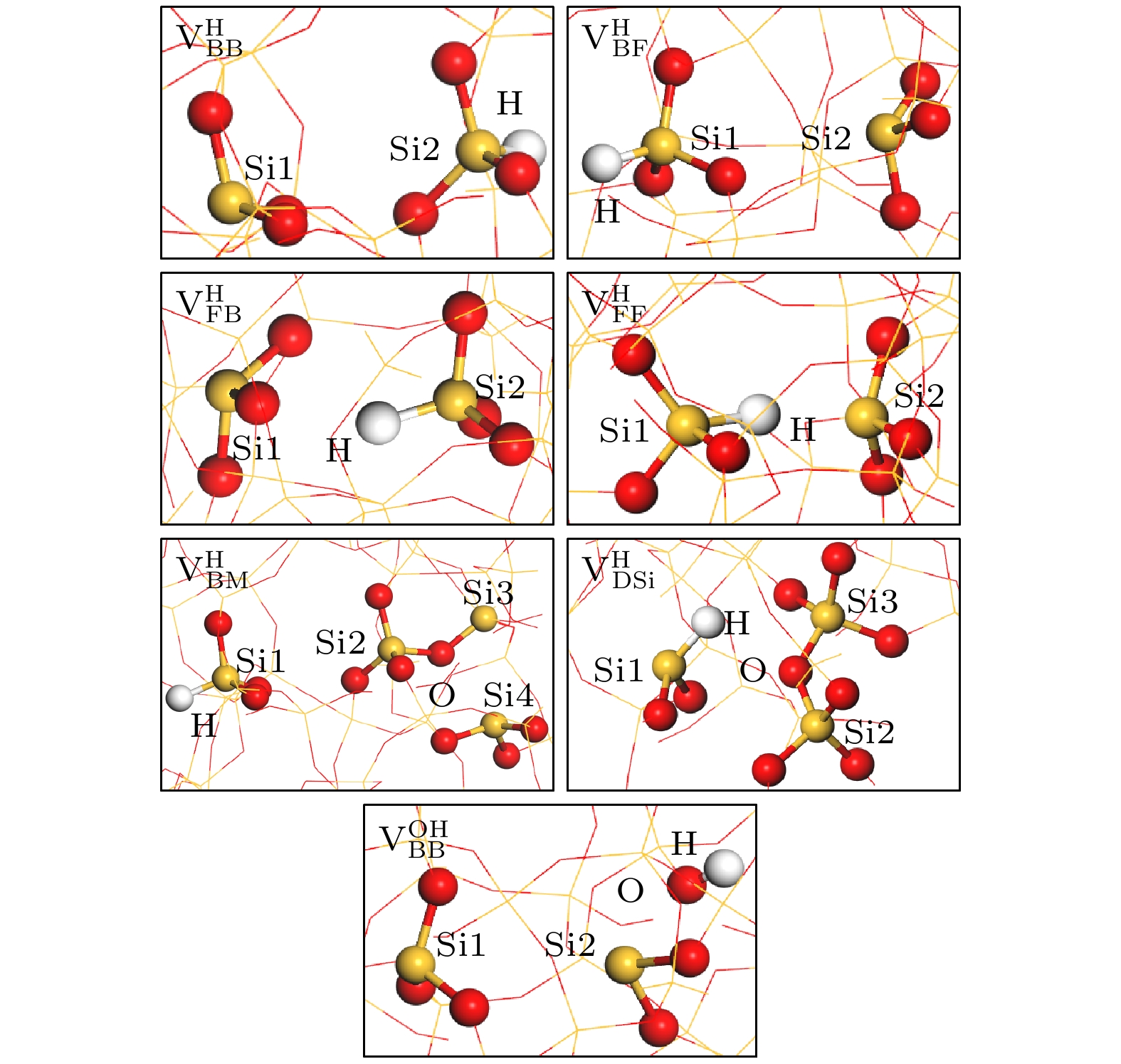 $ {\mathrm{V}}^{\mathrm{H}} $ 和$ {\mathrm{V}}^{\mathrm{O}\mathrm{H}} $ 两大类构型. 在$ {\mathrm{V}}^{\mathrm{H}} $ 构型中, 氢原子通过形成Si—H键实现对缺陷硅原子的钝化, 同时存在悬挂键. 而$ {\mathrm{V}}^{\mathrm{O}\mathrm{H}} $ 构型的结构则以硅羟基(Si—O—H)和悬挂键共存为特征. 根据Si—H键(或Si—O—H)和悬挂键的空间朝向差异可对缺陷构型进行进一步细分, 当其背向氧空位时记为后向(backward, B), 反之则归类为前向(forward, F). 构型下标两个字母依次对应 Si—H键(或Si—O—H键)和悬挂键的朝向. 在$ {\mathrm{V}}^{\mathrm{H}} $ 构型中, 当Si—H键和悬挂键分布在不同的缺陷硅原子上时, 根据其朝向可划分为$ {\mathrm{V}}_{\mathrm{B}\mathrm{B}}^{\mathrm{H}} $ ,$ {\mathrm{V}}_{\mathrm{B}\mathrm{F}}^{\mathrm{H}} $ ,$ {\mathrm{V}}_{\mathrm{F}\mathrm{B}}^{\mathrm{H}}$ 和$ {\mathrm{V}}_{\mathrm{F}\mathrm{F}}^{\mathrm{H}} $ 四类构型. 另外, 还有一种由缺陷跨网格迁移(migration, M)后形成的$ {\mathrm{V}}_{\mathrm{B}\mathrm{M}}^{\mathrm{H}} $ 构型. 当Si—H键和悬挂键出现在同一缺陷硅原子上时, 该构型定义为$ {\mathrm{V}}_{\mathrm{D}\mathrm{S}\mathrm{i}}^{\mathrm{H}} $ 构型.$ {\mathrm{V}}^{\mathrm{O}\mathrm{H}} $ 构型中, 目前仅观察到$ {\mathrm{V}}_{\mathrm{B}\mathrm{B}}^{\mathrm{O}\mathrm{H}} $ 构型, 其特征表现为Si—O—H和悬挂键均朝向氧空位反方向.中性氢化氧空位缺陷的结构参数显示