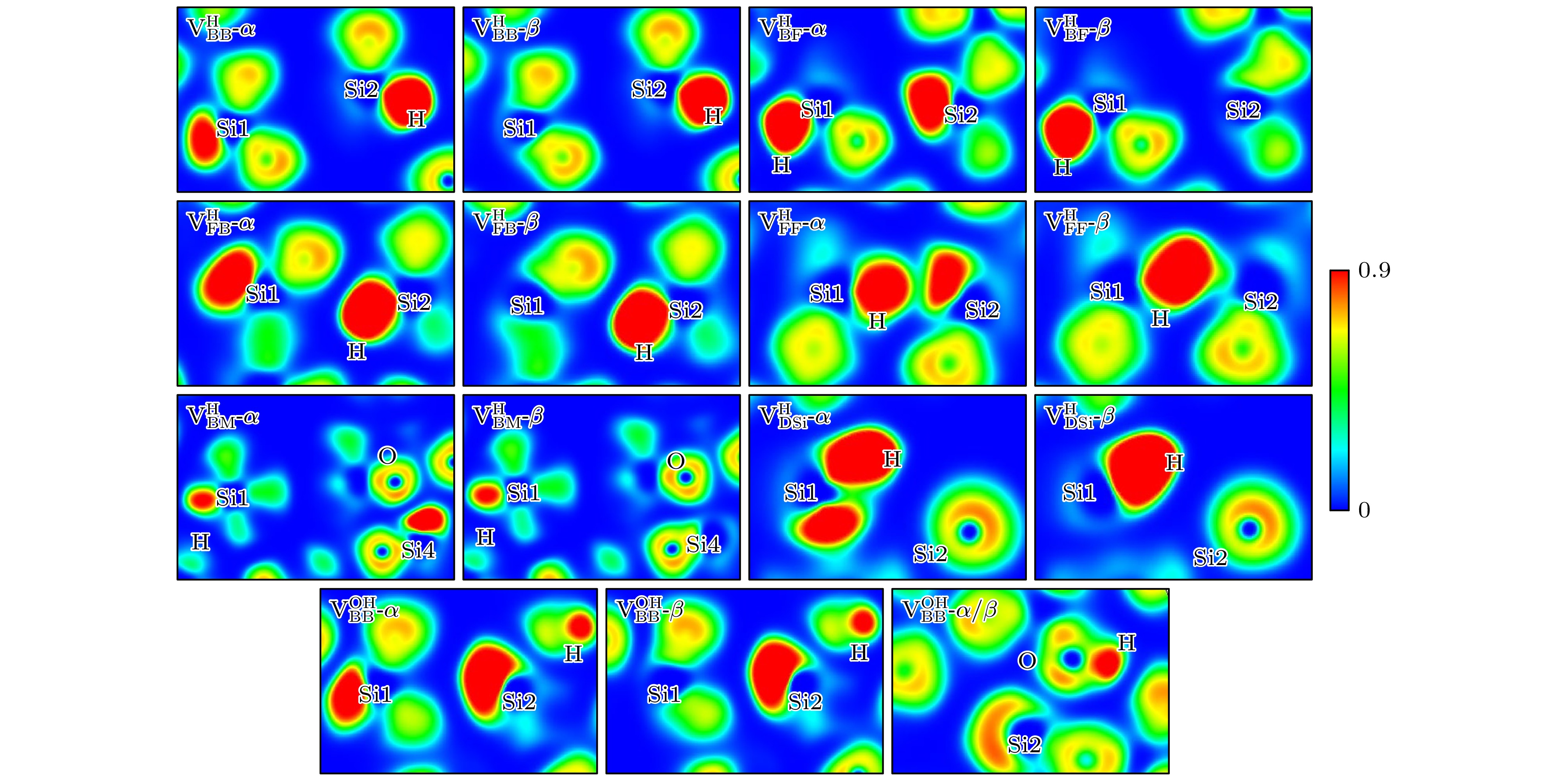 $ {\mathrm{V}}_{\mathrm{F}\mathrm{F}}^{\mathrm{H}} $ 构型具有最小的缺陷硅原子间距(3.39 Å),$ {\mathrm{V}}_{\mathrm{B}\mathrm{M}}^{\mathrm{H}} $ 构型则表现出最大间距(8.18 Å),$ {\mathrm{V}}_{\mathrm{B}\mathrm{B}}^{\mathrm{H}} $ 构型以4.93 Å次之, 其余构型包括$ {\mathrm{V}}_{\mathrm{B}\mathrm{B}}^{\mathrm{O}\mathrm{H}} $ 在内的缺陷硅原子间距在3.39—4.93 Å内. 在$ {\mathrm{V}}_{\mathrm{B}\mathrm{B}}^{\mathrm{H}} $ ,$ {\mathrm{V}}_{\mathrm{B}\mathrm{F}}^{\mathrm{H}} $ ,$ {\mathrm{V}}_{\mathrm{F}\mathrm{B}}^{\mathrm{H}} $ ,$ {\mathrm{V}}_{\mathrm{F}\mathrm{F}}^{\mathrm{H}} $ 及$ {\mathrm{V}}_{\mathrm{B}\mathrm{M}}^{\mathrm{H}} $ 构型中, 氢原子钝化后形成的Si—H平均键长为1.45 Å. 被钝化硅原子的Si—O平均键长为1.65 Å, 较未被钝化一侧的键长缩短了0.01 Å. 钝化后的O—Si—O平均键角为109.35°, 相比未钝化的108.25°更接近理想四面体角度. 这表明氢钝化能够缓解上述构型中悬挂键与邻近Si—O键之间的电子排斥作用. 并且通过ELF分析发现, 氢原子通过与$ {\mathrm{V}}_{\mathrm{B}\mathrm{B}}^{\mathrm{H}} $ ,$ {\mathrm{V}}_{\mathrm{B}\mathrm{F}}^{\mathrm{H}} $ ,$ {\mathrm{V}}_{\mathrm{F}\mathrm{B}}^{\mathrm{H}} $ ,$ {\mathrm{V}}_{\mathrm{F}\mathrm{F}}^{\mathrm{H}} $ 及$ {\mathrm{V}}_{\mathrm{B}\mathrm{M}}^{\mathrm{H}} $ 构型缺陷硅原子形成共价键, 两个未成对电子重新分布在同一sp3轨道的两个自旋方向上. 而在未被钝化一侧, 硅原子的电子分布未发生明显改变. 特别的是在$ {\mathrm{V}}_{\mathrm{D}\mathrm{S}\mathrm{i}}^{\mathrm{H}} $ 构型中, Si1原子从sp2杂化转变为sp3杂化, 使其O—Si—O键角由99.67°增至107.95°. 原sp2杂化轨道中的两个电子, 一个参与Si—H键的形成, 另一个重新定域形成新的悬挂键, 且仅存在于单一自旋轨道中. 悬挂键的存在也对$ {\mathrm{V}}_{\mathrm{D}\mathrm{S}\mathrm{i}}^{\mathrm{H}} $ 构型中参与形成Si—H键的成键电子产生排斥作用, 使Si—H键长增至1.48 Å.在