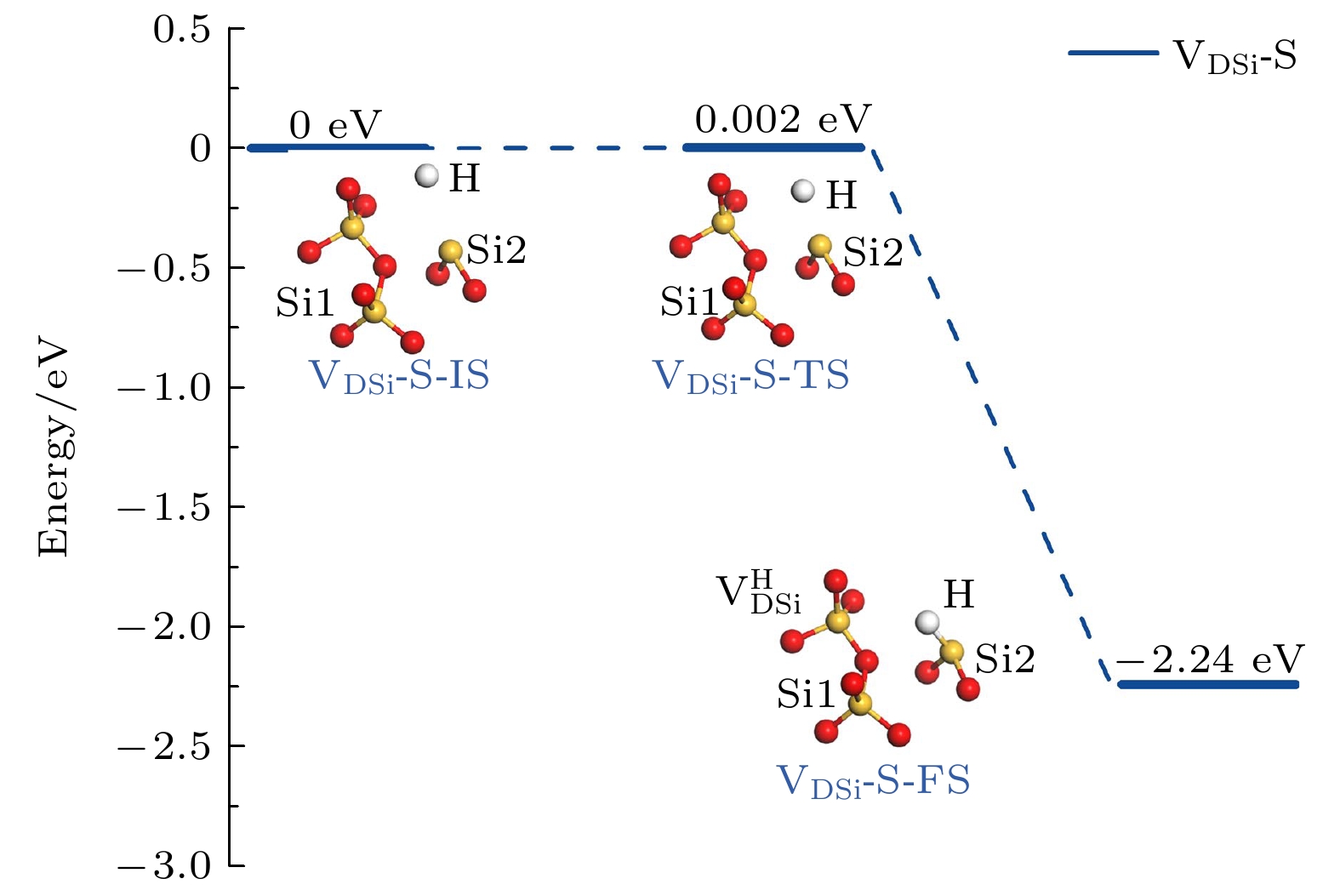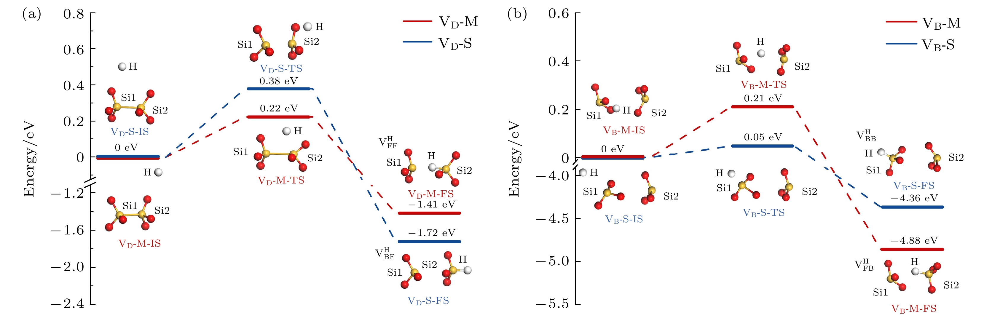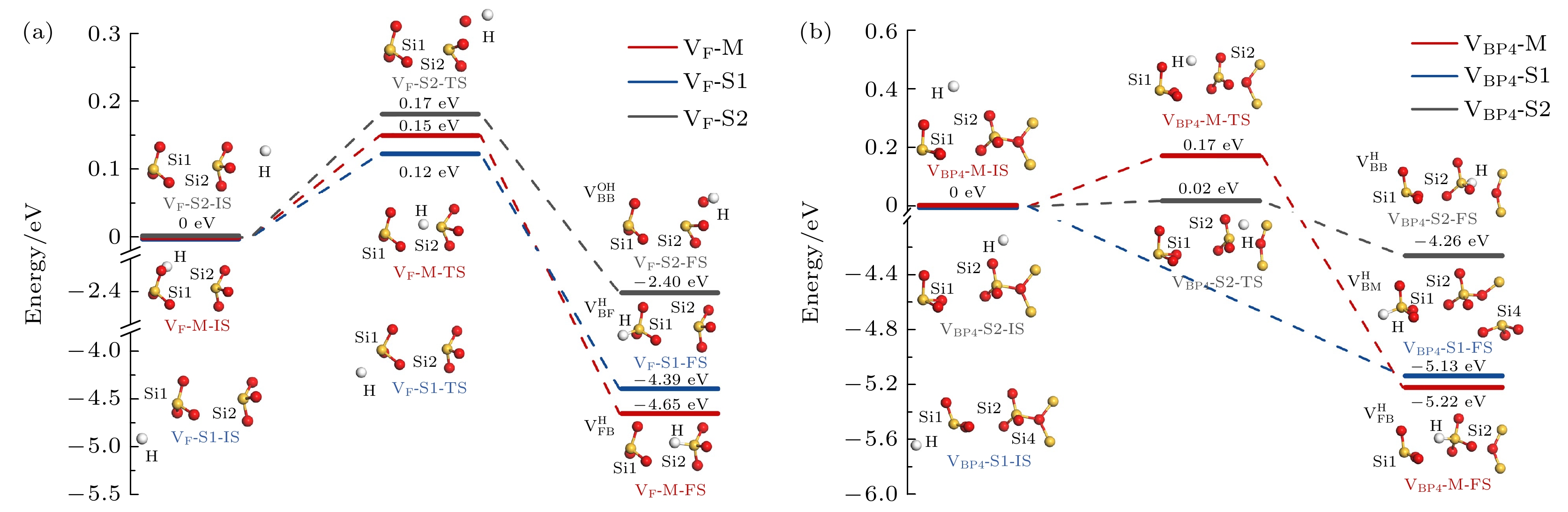 $ {\mathrm{V}}_{\mathrm{F}} $ 和$ {\mathrm{V}}_{\mathrm{B}\mathrm{P}4} $ 分别与氢原子反应路径和能量曲线如图7所示. 对$ {\mathrm{V}}_{\mathrm{F}} $ 构型, 沿$ {\mathrm{V}}_{\mathrm{F}} $ -M和$ {\mathrm{V}}_{\mathrm{F}} $ -S1路径反应时, 氢原子的电子直接填充到缺陷硅原子的悬挂键轨道中, 分别形成$ {\mathrm{V}}_{\mathrm{F}\mathrm{B}}^{\mathrm{H}} $ 和$ {\mathrm{V}}_{\mathrm{B}\mathrm{F}}^{\mathrm{H}} $ 构型. 这两个反应具有相似的反应能垒(0.15 eV和0.12 eV), 并且释放能量也相近(4.65 eV和4.39 eV). 而沿$ {\mathrm{V}}_{\mathrm{F}} $ -S2路径反应时, 氢原子的逐渐靠近使Si2原子的一个Si—O键断裂, 继而在相邻硅原子处形成Si—O—H键, 最终生成含有硅羟基的$ {\mathrm{V}}_{\mathrm{B}\mathrm{B}}^{\mathrm{O}\mathrm{H}} $ 构型, 该过程能垒为0.17 eV, 释放能量为2.40 eV. 需注意的是, 产生的硅羟基可能进一步与邻近的质子或氢原子反应, 释放水分子, 这一过程可为SiO2氧化层或Si/SiO2界面处水分子的生成提供理论支持[67].在氢原子与