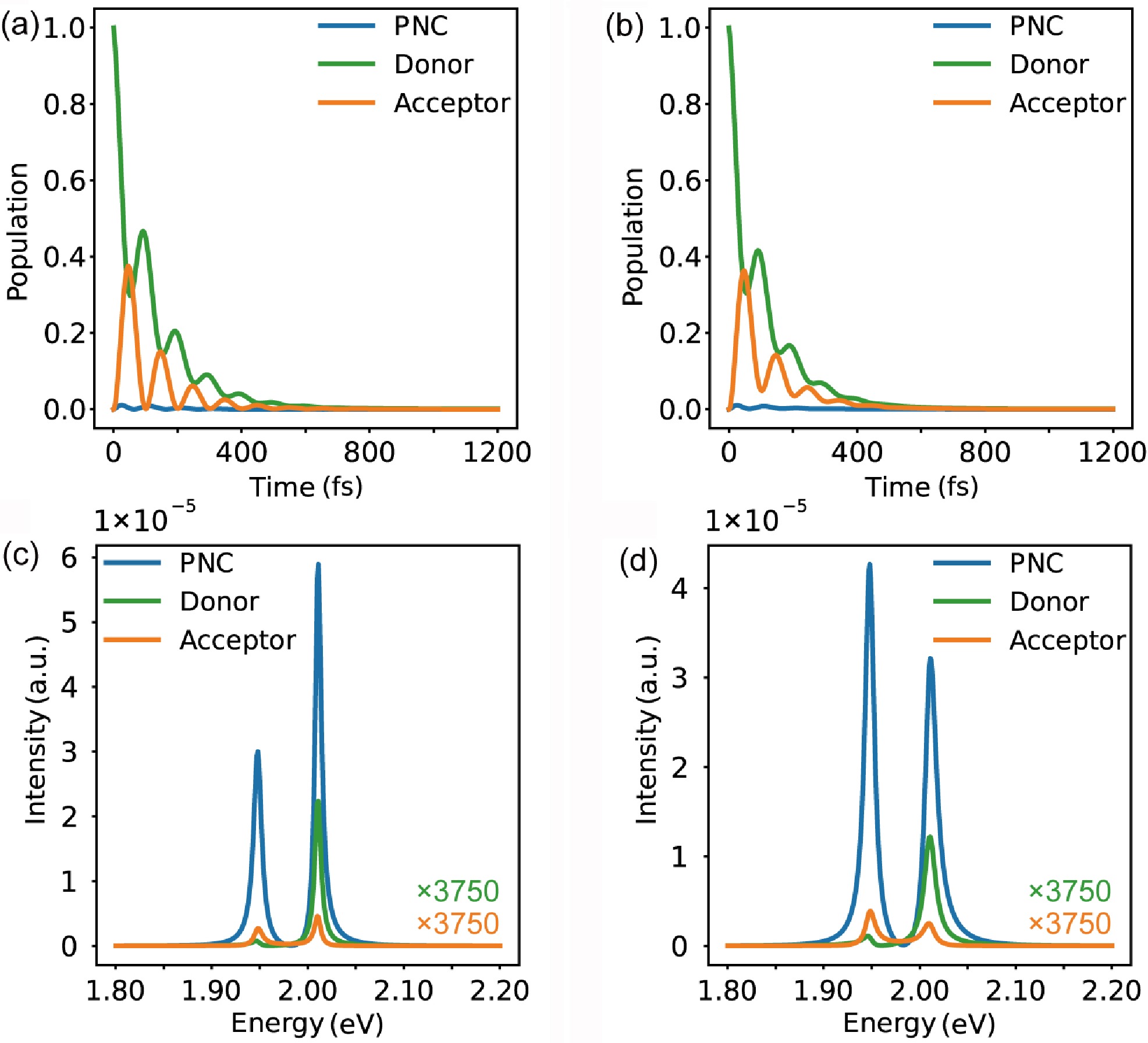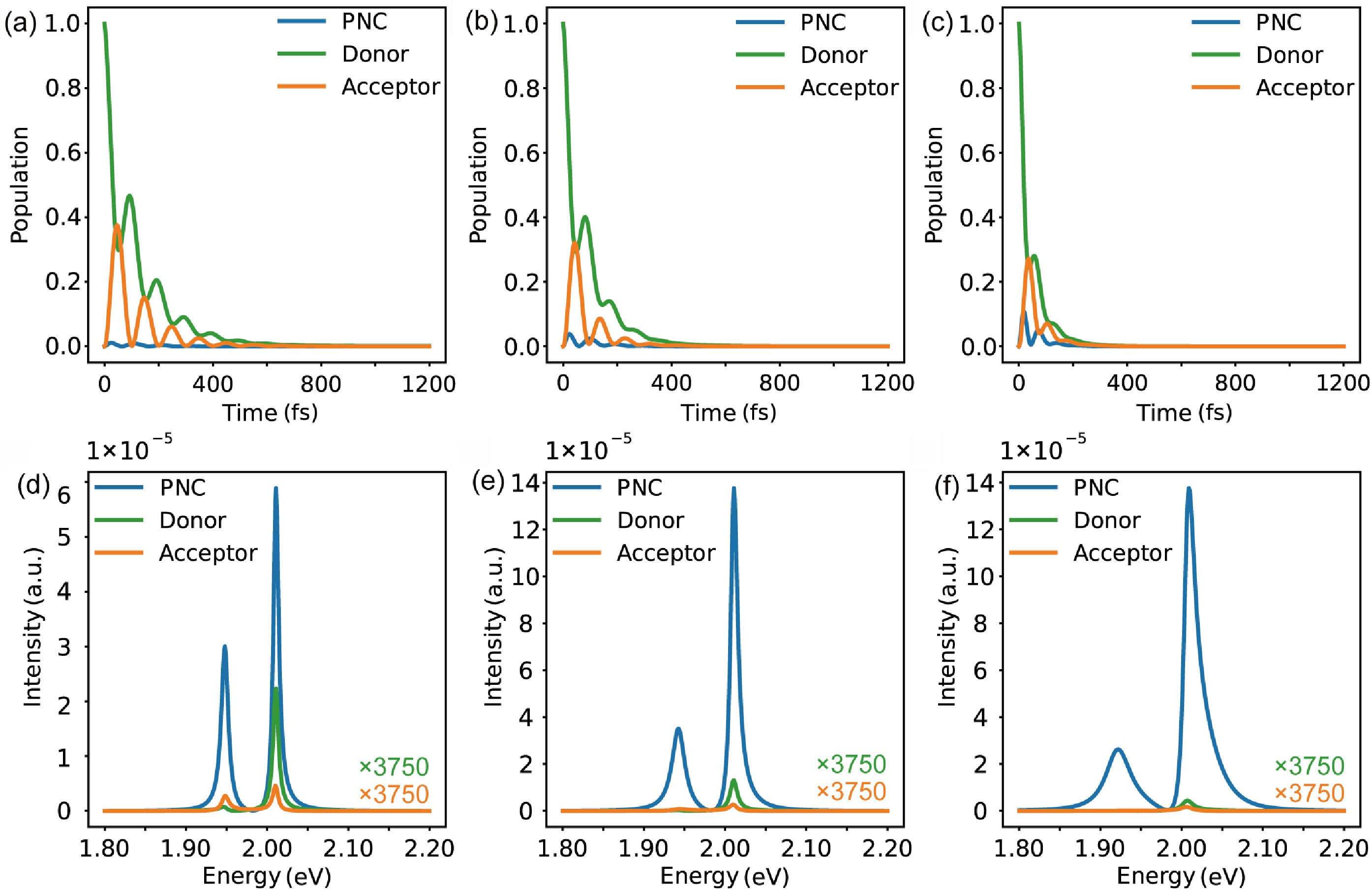 ${\omega }_{\textrm{D}}=2.0$ eV,${\omega }_{\textrm{A}}=1.96$ eV,${\omega }_{\textrm{PNC}}=2.0$ eV,${g}_{\textrm{D-A}}=-0.023$ eV,${\gamma }_{\textrm{D}}^{\textrm{total}}=0.007$ eV,${\gamma }_{\textrm{A}}^{\textrm{total}}=0.007$ eV,${\gamma }_{\textrm{PNC}}^{\textrm{total}}=0.120$ eV,${\gamma }_{\textrm{D}}^{\textrm{deph}}=0.000\ {\rm{eV}}$ ,${\gamma }_{\textrm{A}}^{\textrm{deph}}=0.000\ {\rm{eV}}$ ; for (a, d),${g}_{\textrm{D-PNC}}={g}_{\textrm{A-PNC}}=0.010$ eV, for (b, e),${g}_{\textrm{D-PNC}}={g}_{\textrm{A-PNC}}=0.020$ eV, and for (c, f),${g}_{\textrm{D-PNC}}={g}_{\textrm{A-PNC}}=0.040$ eV. The emission intensities of the donor and acceptor molecules in (d, e, f) are multiplied by 3750 for display. -