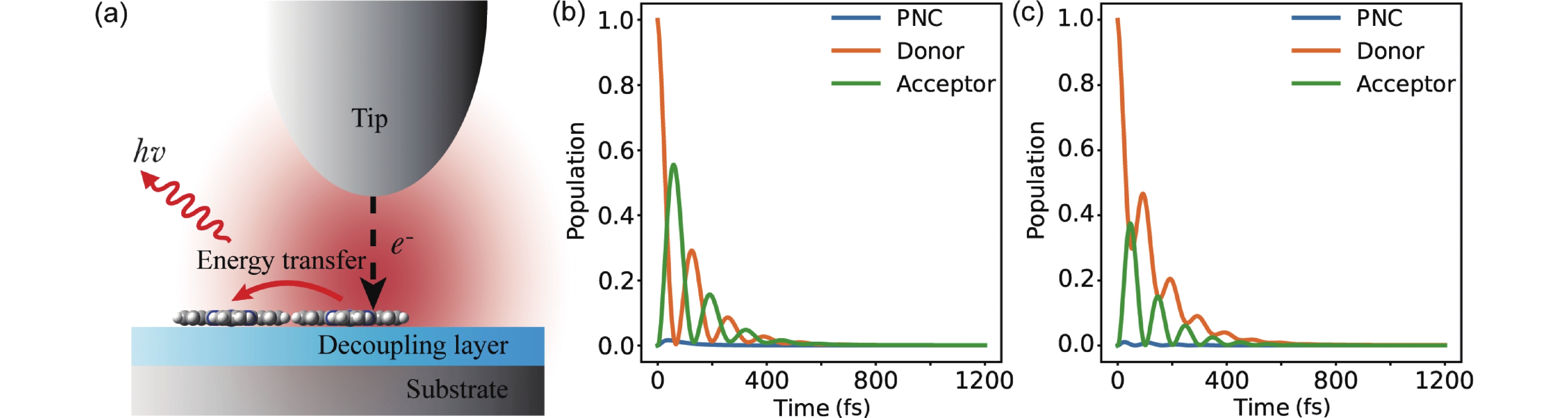 Figure 2. Resonant and non-resonant energy transfer between coherently coupled donor-acceptor molecules. (a) Schematic of tunneling electrons triggered energy transfer in the plasmonic nanocavity (PNC) coupled donor-acceptor molecules system. (b, c) Time dependent populations of the PNC, donor and acceptor molecules, respectively, after the donor molecule is initially excited. For (b, c),