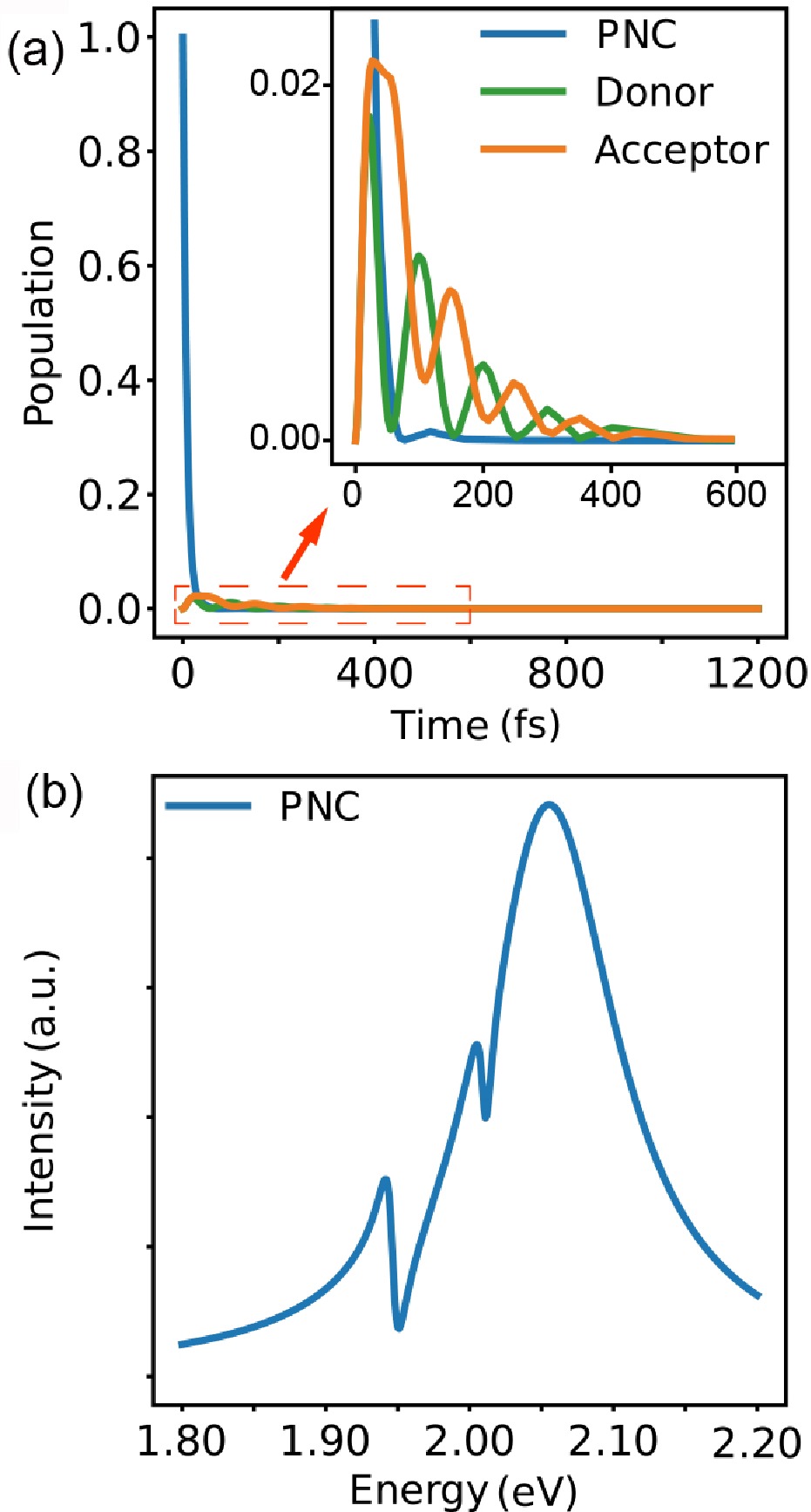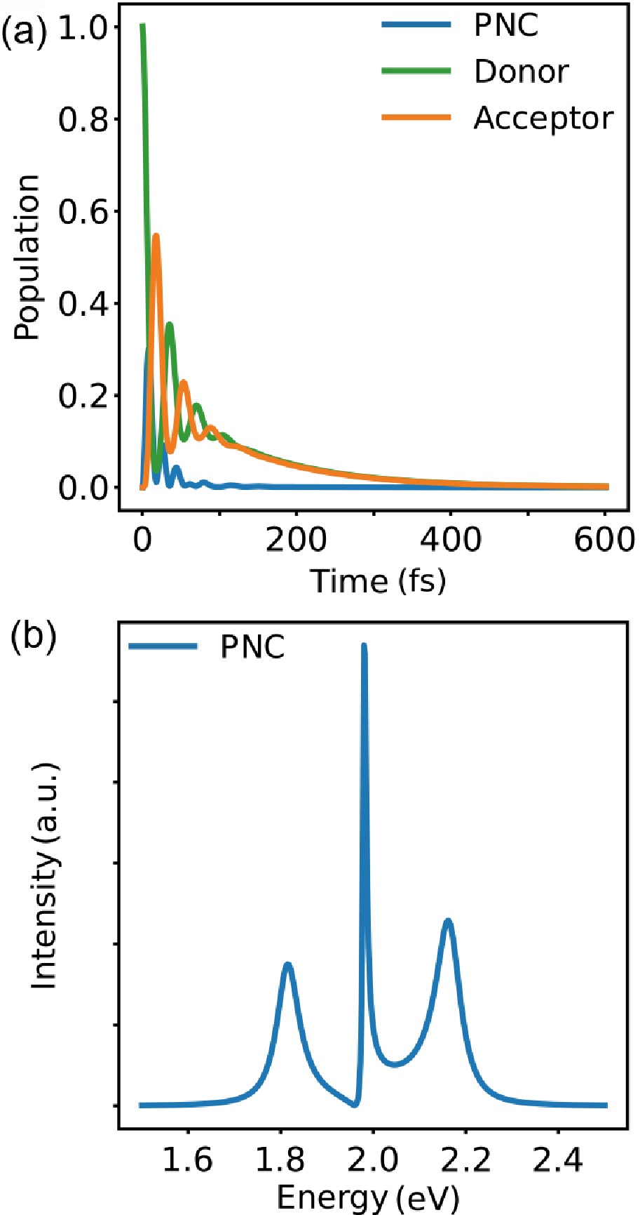 ${\omega }_{\textrm{D}}=2.00$ eV,${\omega }_{\textrm{PNC}}=2.00$ eV,${g}_{\textrm{D-A}}=-0.023$ eV,${g}_{\textrm{D-PNC}}={g}_{\textrm{A-PNC}}=0.010$ eV,${\gamma }_{\textrm{D}}^{\textrm{total}}=0.007$ eV,${\gamma }_{\textrm{A}}^{\textrm{total}}=0.007$ eV,${\gamma }_{\textrm{PNC}}^{\textrm{total}}=0.120$ eV,${\gamma }_{\textrm{D}}^{\textrm{deph}}=0.000\ {\rm{eV}}$ ,${\gamma }_{\textrm{A}}^{\textrm{deph}}=0.000\ {\rm{eV}}$ ; for (b),${\omega }_{\textrm{A}}=2.00$ eV; and for (c),${\omega }_{\textrm{A}}=1.96$ eV. -