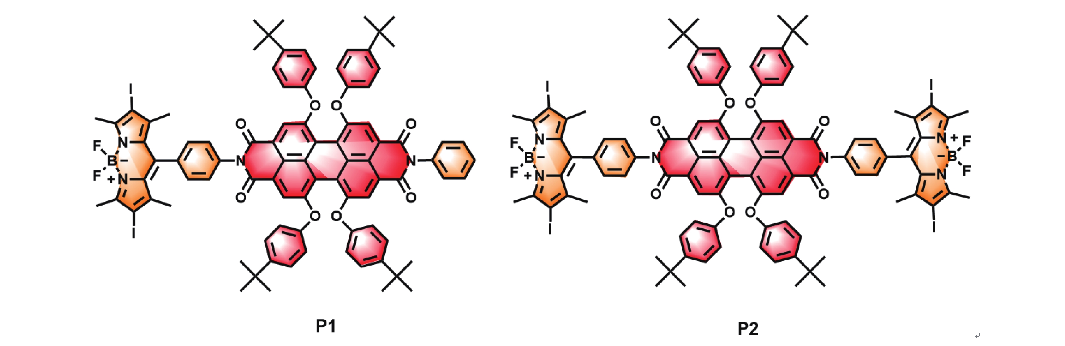 Hence, we designed and synthesized a dyad, P1, containing one diiodo-BODIPY and one PDA, and a triad, P2, containing two diiodo-BODIPYs and one PDA. The molecular structures of the two compounds are given in FIG. 1. The photophysical processes and photooxidation capacities of these two compounds were also studied. Both P1 and P2 exhibit high molar extinction coefficients in the 400–620 nm range. Upon excitation of diiodo-BODIPY, it can transfer the energy from its singlet excited state to PDA. Due to the presence of heavy atoms, PDA can then undergo intersystem crossing to produce a triplet excited state. With two diiodo-BODIPY units, P2 generates the triplet excited state more efficiently and also demonstrates superior photooxidation capabilities.