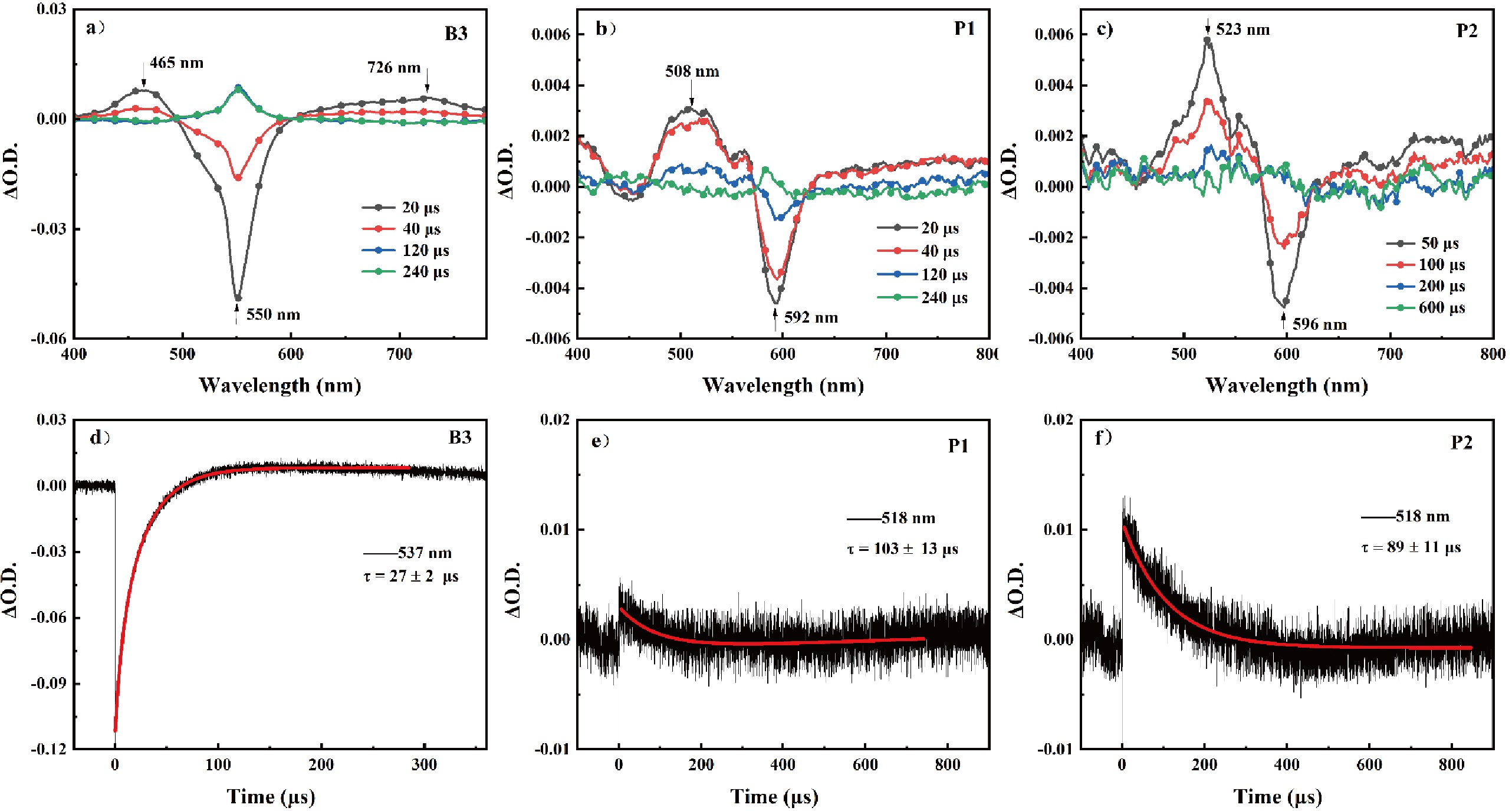 By performing kinetic fitting at 518 nm for P1 and P2, the triplet excited state lifetimes of P1 and P2 are determined to be 103±13 and 89±11 μs, respectively, as shown in FIG. 4(e, f). From FIG. 4(e, f), it can also be seen that the maximum triplet state signal for P2 is around 0.01, while for P1 it is less than 0.005, indicating that P2 has a higher triplet state efficiency. This is consistent with the results of the fluorescence analysis.