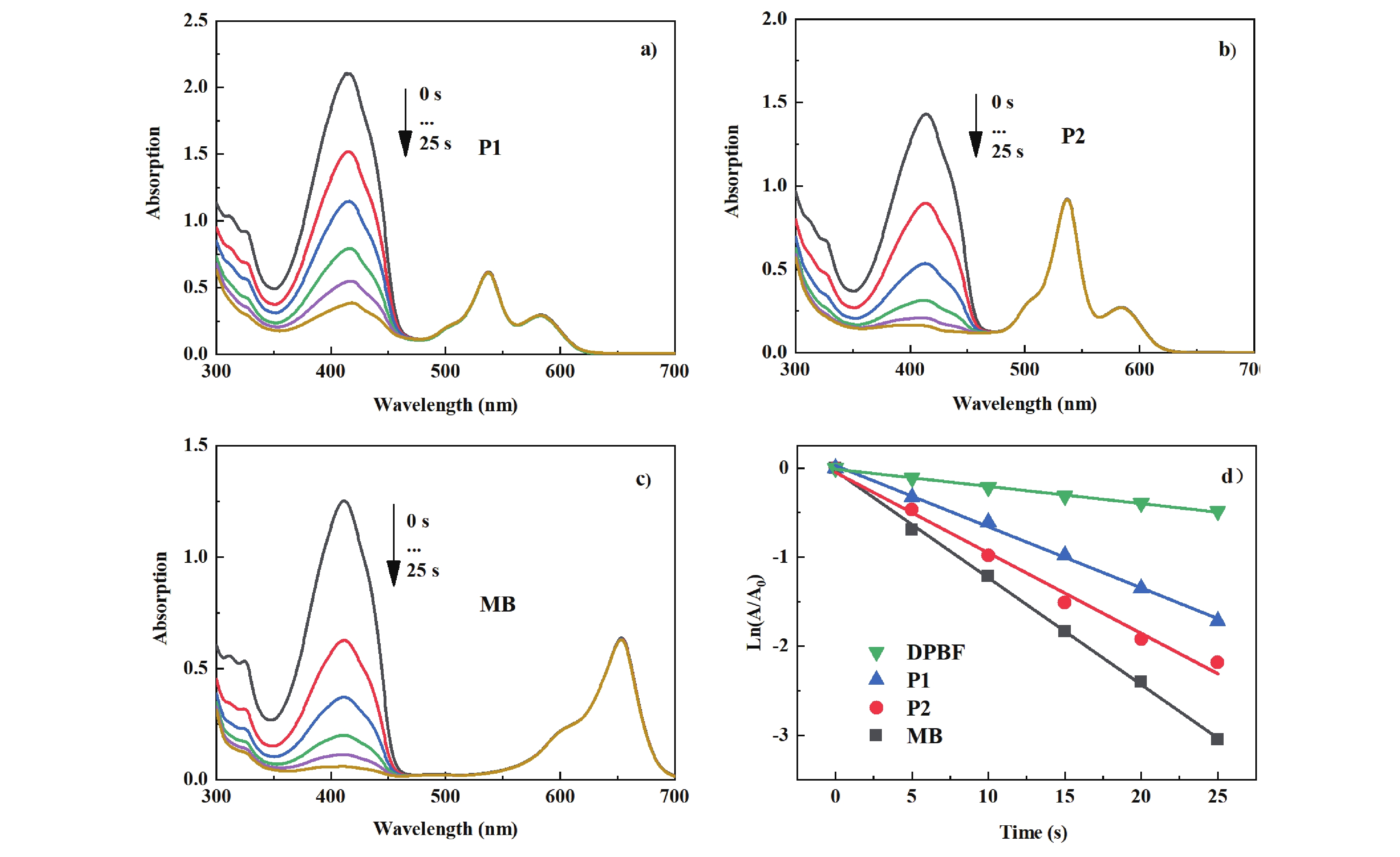 Using MB as a reference, the singlet oxygen quantum yields (Φ△) of P1 and P2 were also calculated. The Φ△ of P2 is 0.37, while that of P1 is 0.23. The results of the photooxidation are consistent with those obtained from fluorescence and nanosecond transient absorption studies.