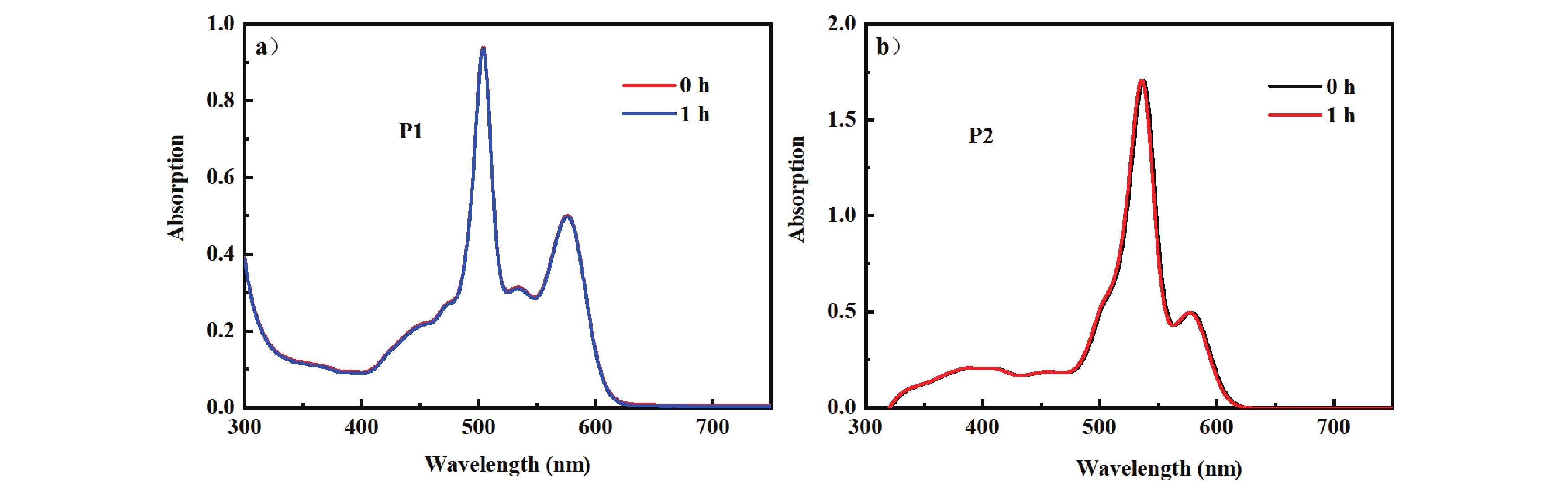 From FIG. 6, it can be observed that after continuous illumination for 1 h, the absorption peaks of P1 and P2 do not change, indicating that P1 and P2 possess excellent photostability. This also demonstrates that the decrease in the absorption peak of DPBF at 414 nm is due to photooxidation, rather than the photodegradation of the PS itself.