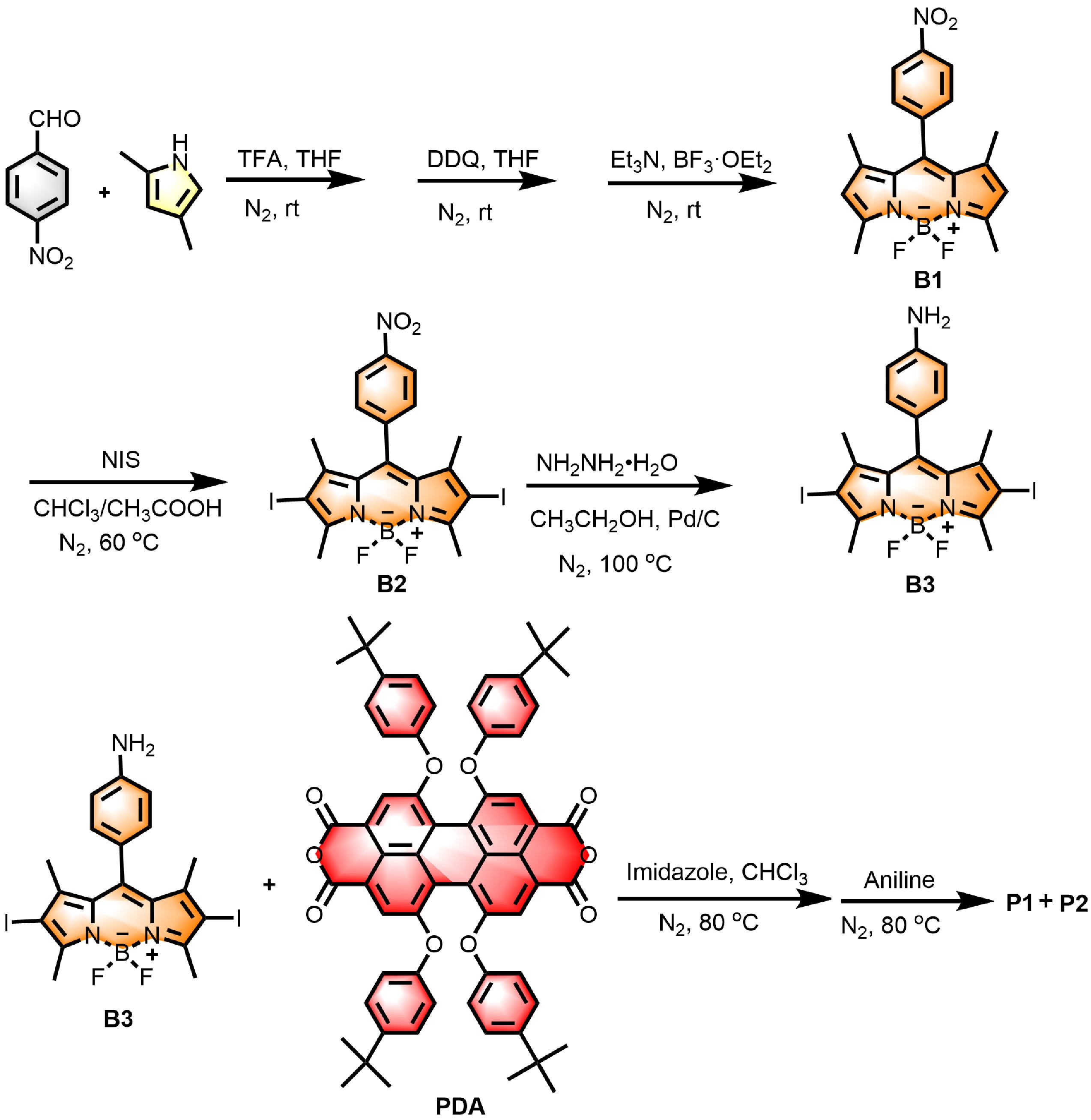 The synthesis routes of compounds P1 and P2 are shown in Scheme 1, and the synthetic details are provided in the Experimental Section of the Supplementary materials (SM). According to previously reported methods [14], nitro boron-dipyrromethene B1 was synthesized from 2,4-dimethylpyrrole and p-nitrobenzaldehyde via a one-pot method. Then, under acidic conditions, using NIS (N-iodosuccinimide) as the iodinating agent, the diiodo-BODIPY B2 was synthesized. Subsequently, B2 was reduced by hydrazine hydrate to obtain compound B3. Finally, B3 reacted with PDA under the catalysis of imidazole to carry out the amide reaction, synthesizing a monomeric intermediate containing one diiodo-BODIPY group and P2 with diiodo-BODIPY moieties on both sides. Due to the strong adsorption of PDA’s monoanhydride containing one diiodo-BODIPY on column chromatography, making it difficult to separate, this reaction step proceeded without separation and was directly followed by reaction with aniline. After separation and purification, 31% of P1 and 52% of P2 were obtained.