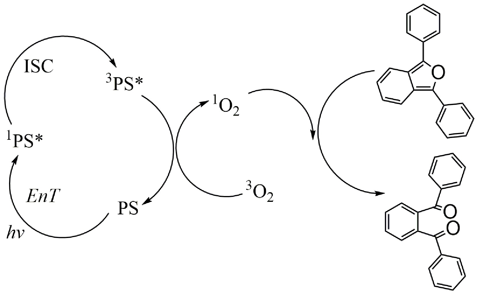 Finally, DPBF (1,3-diphenylisobenzofuran) was employed as a chemical sensor to investigate the photooxidation capacities of P1 and P2. Upon oxidation by singlet oxygen (1O2), DPBF undergoes a ring-opening reaction, transforming its epoxy group into a ketone [25]. This oxidation pathway, facilitated by 1O2, is depicted in Scheme 2. The process begins with the PS being excited from its ground state (S0) to an excited state (Sn). This leads to the formation of a singlet excited state (1PS*), which subsequently transfers to a triplet excited state (3PS*) through ISC. Then 3PS* is capable of sensitizing 3O2 to 1O2, resulting in the oxidation of DPBF to ketones [26]. DPBF exhibits an absorption peak at 414 nm, which notably diminishes upon oxidation by 1O2.