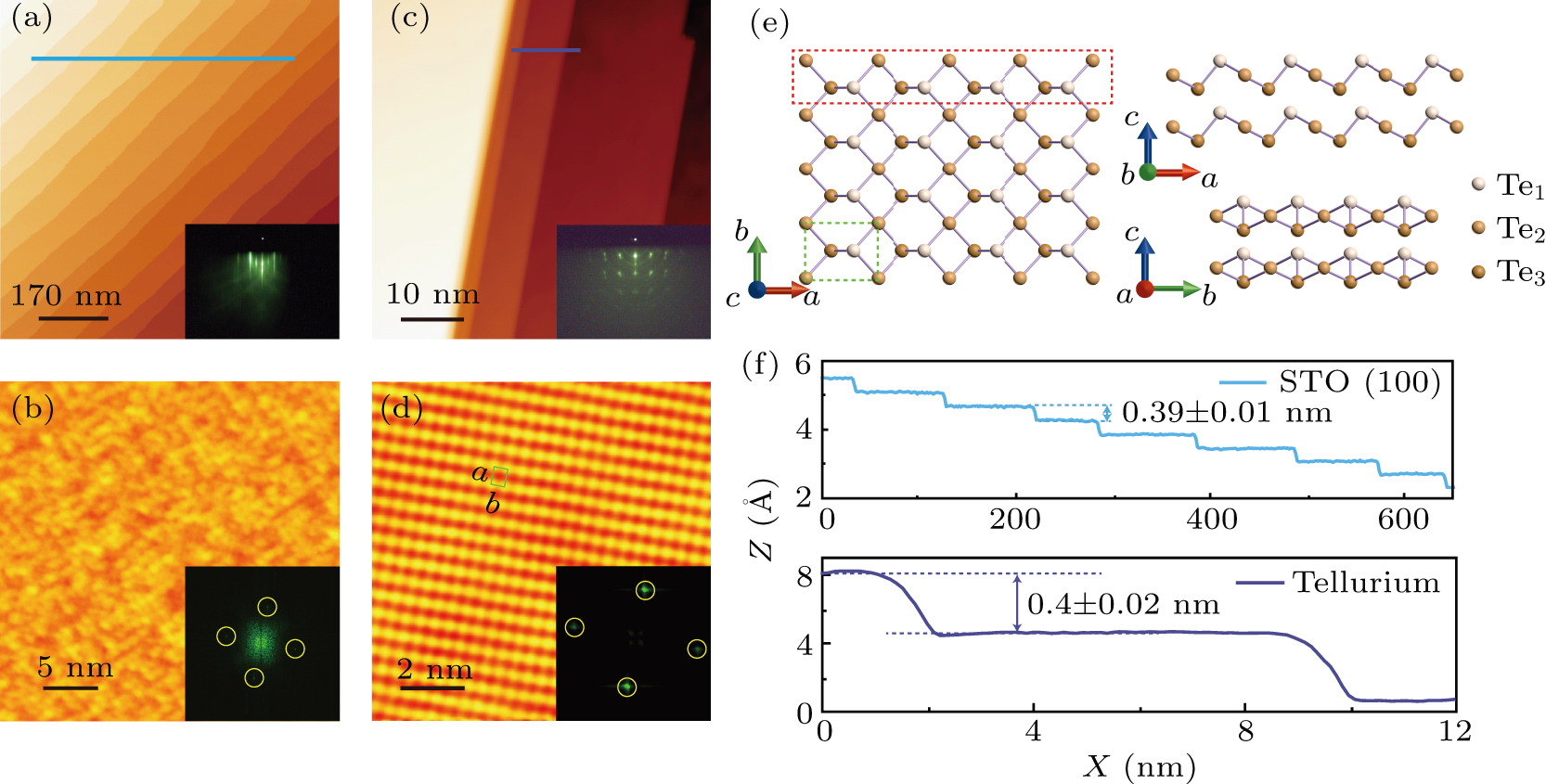 At ambient conditions, the bulk Te is one kind of narrow bandgap semiconductor (∼ 0.34 eV), formed of parallel-arranged helical Te chains of atoms and belonging to the trigonal lattice. The interchain atoms are connected via van-der-Waals interactions in contrast to the intrachain strong covalent bonds. The helical chains of Te form a hexagonal network in the plane perpendicular to the chains. The helicities of Te chains are distinguished by space groups P3121 and P3221. Bulk Te may undergo a topological band inversion under shear (hydrostatic or uniaxial) strain.[17] In the thin-film case, recent theories and experiments show that Te has three phases: α-Te, γ-Te, and β-Te. Here α-Te and γ-Te are formed owing to the multivalency of Te.[18] When the thickness of bulk Te is reduced to a few layers, the bulk phase automatically transforms into the β-Te phase, which is the most stable structure among these three phases. Furthermore, the theoretical calculation has predicted a new phase, the square-Te, which is a 2D topological insulator that opens an inversion band gap of nearly 170 meV.[19] A substrate with suitable lattice parameters is a prerequisite for the MBE growth of desired phase. To realize the possible non-trivial phase of Te, SrTiO3 (STO) (001) is the promising substrate because of its small lattice mismatch (<1%) with square-phase Te.[20] Currently, some experiments have been successful in producing Te films. Nonetheless, among the various reports on the MBE growth of β-Te films on graphene, HOPG, and NbSe2 substrates,[21–24] there is no attempt on the substrates with square lattice. In addition, up to now, ultra-thin films of Te with full-coverage and controllable thickness have not been achieved.